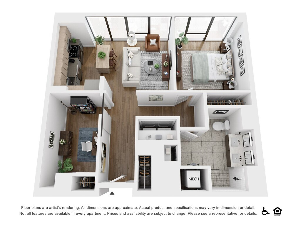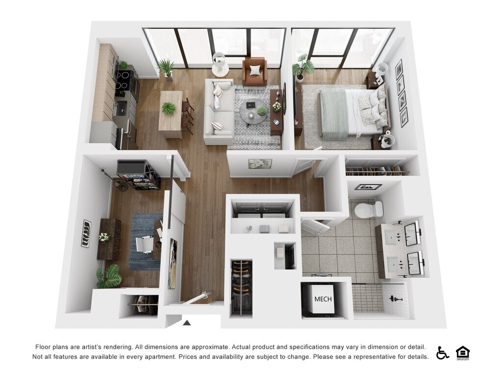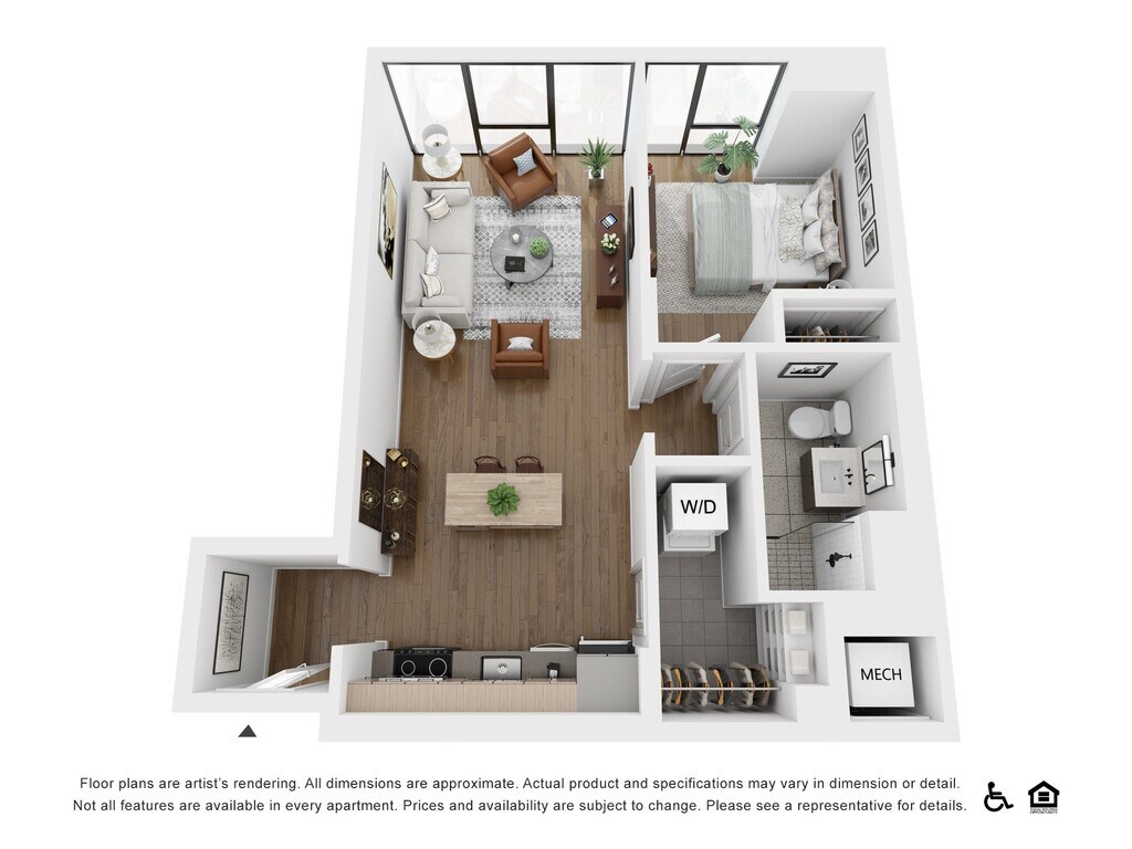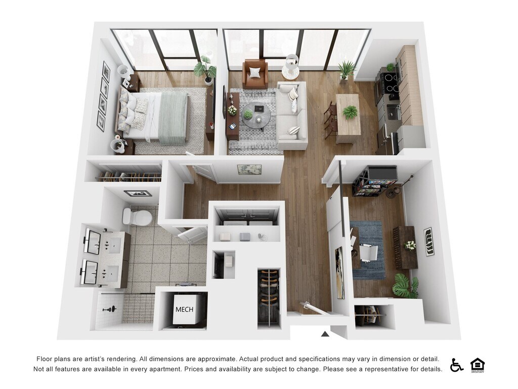 One Bedroom 1A - Plano 1 Los planos de la planta son una interpretación artística. Todas las dimensiones son aproximadas. Los tamaños o el detalle del producto real y sus especificaciones pueden variar. No todas las características están disponibles en todos los hogares para rentar. Los precios y la disponibilidad están sujetos a cambios. El alquiler que se muestra es mensual. Se pueden aplicar ciertos cargos, por ejemplo, entrega de paquetes, recolección de basura, agua, servicios, etc. Depositos varian. Consulta a un representante para conocer detalles.