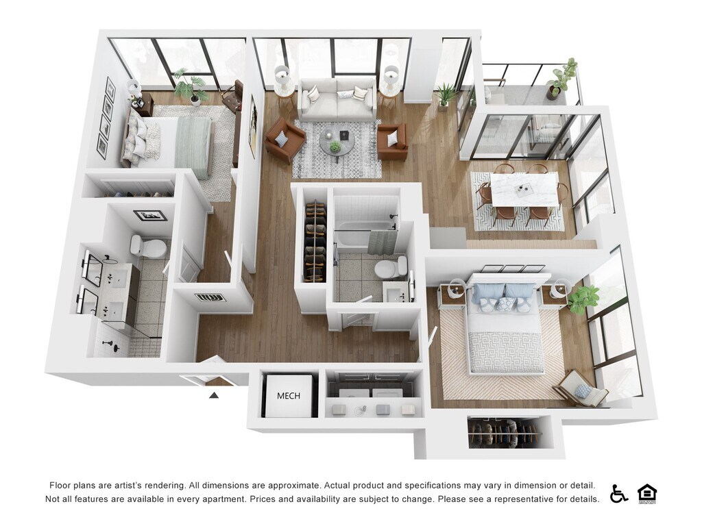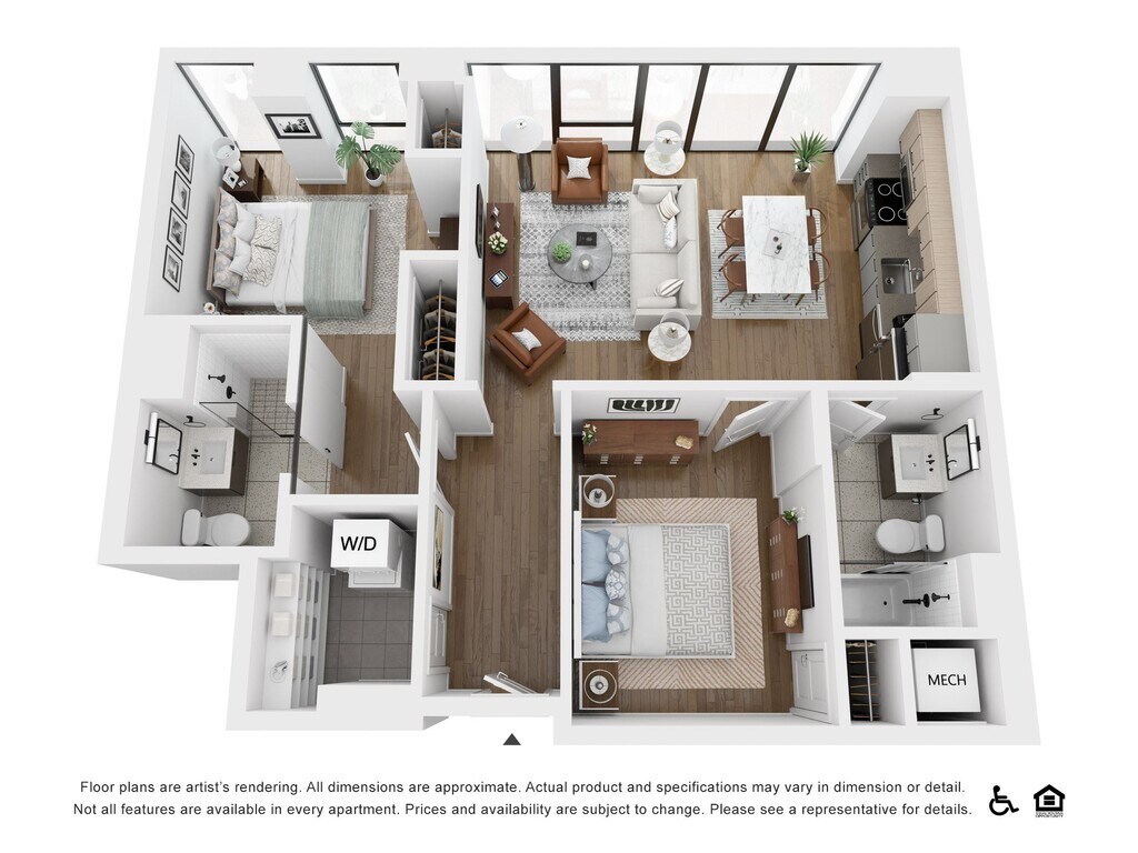 One Bedroom 1A - Plano 2 Los planos de la planta son una interpretación artística. Todas las dimensiones son aproximadas. Los tamaños o el detalle del producto real y sus especificaciones pueden variar. No todas las características están disponibles en todos los hogares para rentar. Los precios y la disponibilidad están sujetos a cambios. El alquiler que se muestra es mensual. Se pueden aplicar ciertos cargos, por ejemplo, entrega de paquetes, recolección de basura, agua, servicios, etc. Depositos varian. Consulta a un representante para conocer detalles.