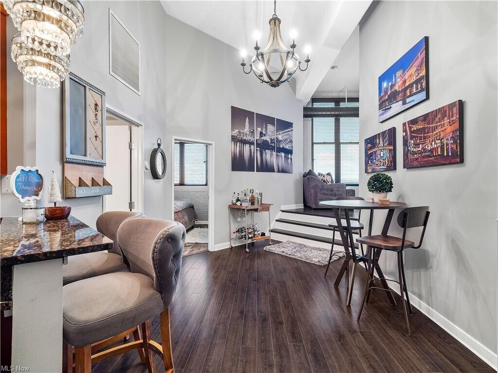 VIEWS!!! Absolute GEM in Downtown Cleveland with FABULOUS water and stadium views. In addition to gorgeous updates, this condominium comes fully furnished!!! The home has been modernized with new flooring in the in bedrooms, solid wooden doors, new hot water tank (2023), all new beautiful light fixtures. You'll love the home's tall ceilings, sleek flooring, and neutral colors throughout. The kitchen offers upgraded flooring, stainless appliances, ample cabinet space. The living room, with an updated ceiling fan, is situated on a raised level to showcase the fantastic scenery. The primary suite has an ensuite full bath, with refreshed tile, lighting & vanity, and adequate closet space. The roomy second bedroom boasts 2 large windows and is located next to the guest bath with new lighting. This condo is just perfection. Washer & dryer hookups are located in the closet near the front door. The building has an amazing rooftop deck with panoramic views of the City and has a workout room. Wonderful Warehouse District location, just steps from the East Bank of The Flats, grocery stores, nightlife, amazing restaurants! Move right into this perfect home in the City.
