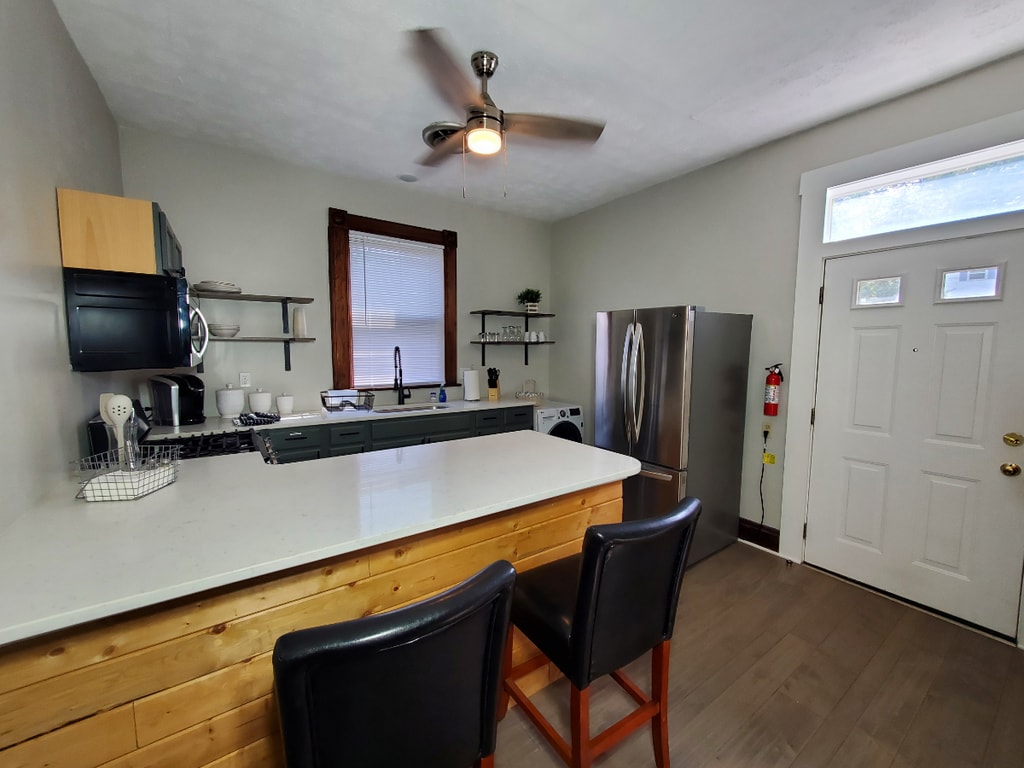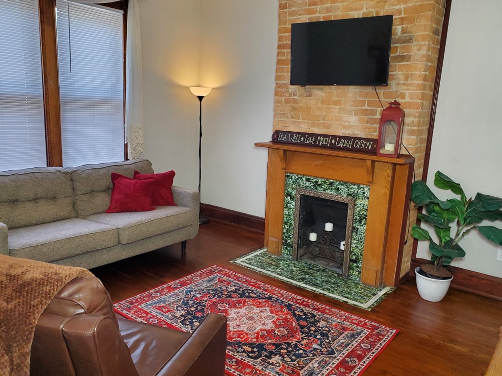 Enjoy comfort in this charming, fully-furnished, one-bedroom, one-bathroom apartment in the heart of Newport, Kentucky. Situated on the second floor, this haven promises tranquility, privacy, and the warm embrace of home from the moment you step inside. The bedroom exudes a sense of calm and relaxation. It is furnished with a very comfortable queen bed, a closet, armoire/TV stand with drawers underneath, a Roku accessible TV (Netflix, Amazon, etc.), a full dresser with plenty of drawers, closed closet (and hangers :) and a nightstand/lamp. The newly remodeled bathroom, with towels and washcloths, echoes the theme of modern comfort with its tub/shower combo, sleek single vanity, and mirror that reflects the thoughtful design throughout the apartment. Step into the living area where comfort meets style. A couch,throw blankets and recliner beckons you to unwind alongside side tables and lamps under a ceiling lamp's ambient glow. A decorative fireplace adds a hint of coziness. The kitchen features a breakfast bar with two bar stools, stainless steel refrigerator, microwave and stove, washer/dryer combo, a Keurig machine, and all the pots/pans/dishes/utensils you will need. From the kitchen, you will find a deck with comfortable chairs and a portable fire pit, perfect for coffee in the morning. The deck overlooks a private, fenced-in backyard. Ceiling fans are in the kitchen, bedroom and living room. There is a free standing fan available for where it is needed. Central heat is available for the winter and window units for the warmer summer months. Just outside the living room is a breakfast nook or work area (whichever you need!), with table and chairs. The breakfast/work area is right by the router, so you can plug your computer directly into the network if you prefer. Internet is 600mbps symmetrical; if you need faster access, it can be raised up to 2 gig (we would just ask that you cover the difference in the monthly cost). Nestled in a peaceful neighborhood on a quiet cul-de-sac, this apartment blends the allure of quiet residential life with the convenience of being just a short walk away from shopping, dining, and entertainment options to enrich your living experience. At the same time, easy highway access ensures you're connected to every urban convenience, just minutes from the sites and sounds of downtown Cincinnati. Welcome to your new sanctuary, where every detail is curated for comfort and enjoyment. Special requests can be accommodated if known in advance. Book now!