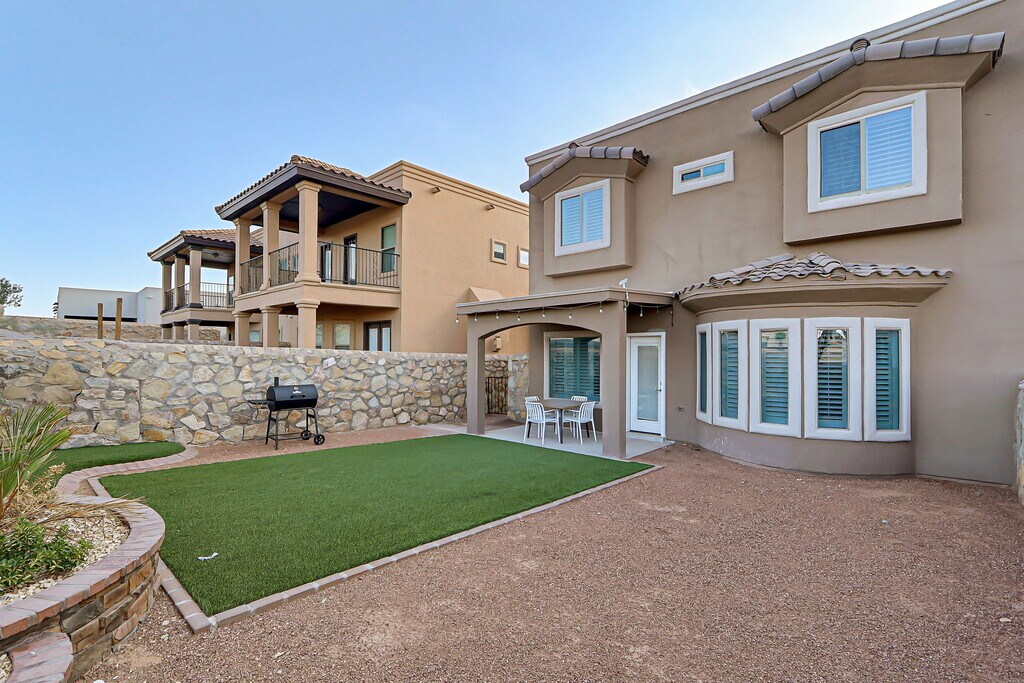 Welcome to Dos Palmas Home, a stylish two-level townhome with a 2-car garage. Designed for comfort and convenience, this property offers quick access to I-10, nearby dining, shopping, and major employers Property Highlights • 3 Bedrooms / 2.5 Baths / 2-Car Garage • Fiber-fast WiFi throughout • Fully furnished with modern décor Bedrooms (Upstairs) • Master Suite: King bed, large closet, dresser, work desk, 58” 4K Smart TV, ensuite bath with double vanity & bathtub • Bedroom 2: Queen bed, closet, work desk, 4K Smart TV, shares bath with tub/shower combo & separate vanity • Bedroom 3: Two twin beds, shared bath & vanity Living & Dining (Downstairs) • Chic living room with modern furniture, coffee table, and large 4K Smart TV • Open kitchen with gas stove, microwave, large refrigerator, and ample counter space • Breakfast bar with 4 stools + breakfast nook with table for 4 Outdoor Living • Covered patio with charcoal grill and outdoor dining set for 4 • Green turf backyard, low-maintenance and perfect for relaxing Extras • Convenient half bathroom on first floor • Laundry room with washer & dryer • 2-car garage parking Nearby Distances • 1 min to I-10 for fast access across El Paso • 5 min to shopping & dining at The Fountains at Farah • 10 min to Del Sol Medical Center & hospitals • 15 min to downtown El Paso & the airport • Surrounded by restaurants, grocery stores, and fitness centers Rental Information • Minimum lease term: 1 month • Occupancy limit: 2 people per bedroom • Non-smoking property • Guests over 18 staying for the full duration must provide a valid photo ID and email address before check-in (for agreement purposes). • Application process includes a background check for all applicants over 18. We are committed to offering a comfortable and safe rental experience, and we look forward to welcoming you to our community!
