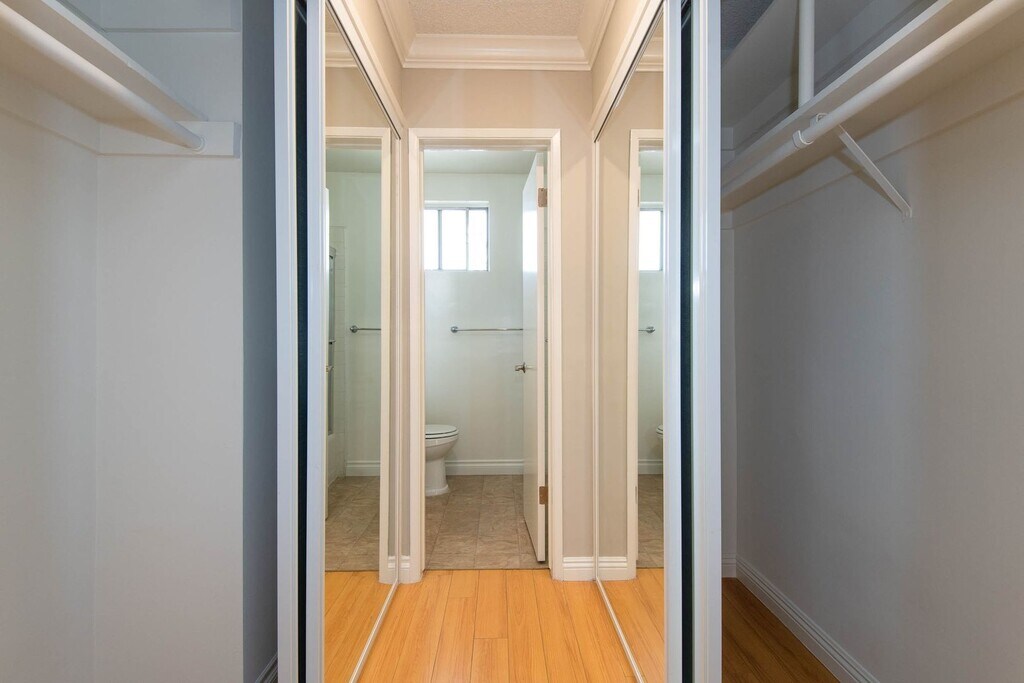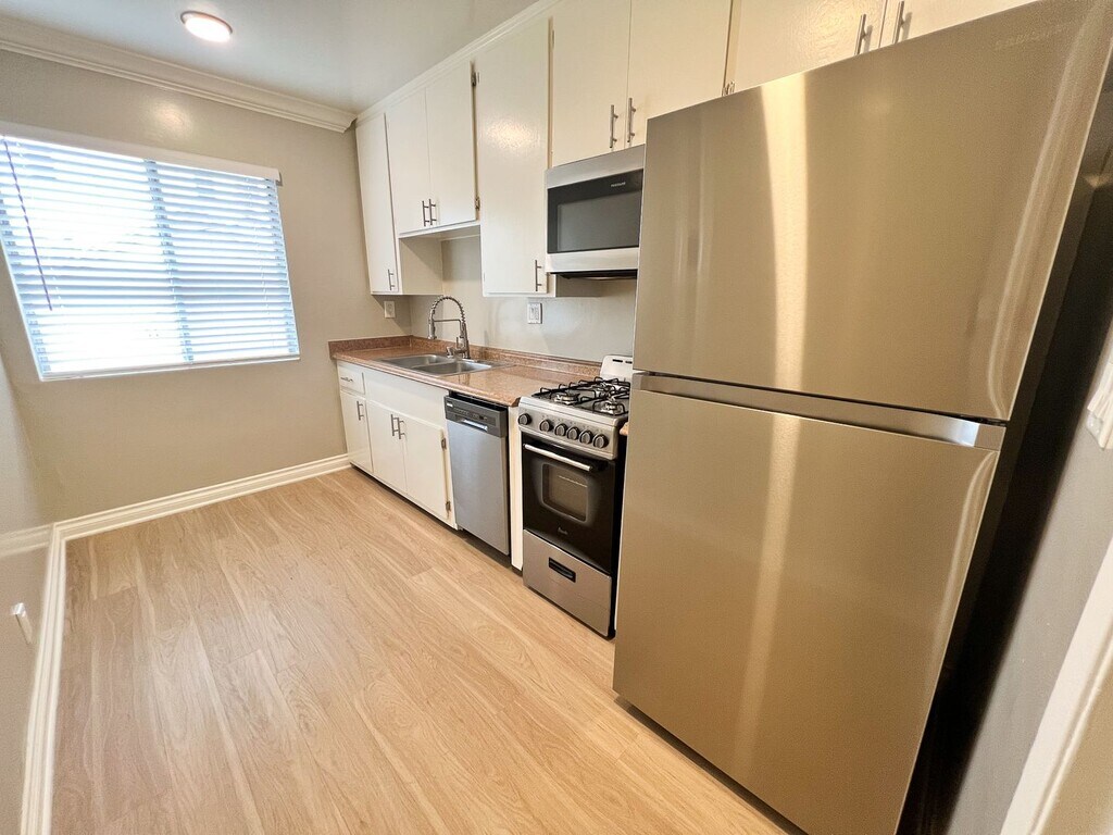 This beautifully remodeled townhome boasts 1,300 sq. ft. of living space with luxurious upgrades throughout! As you enter, you will immediately notice the NEW laminate flooring, the open living and dining floor plan with lots of natural light. The living room is a perfect place to relax and unwind with a shared dining area and direct access to the private balcony that will easily fit an outdoor patio set. There is also a large picture window and a wall A/C that will keep the entire space cool. The designer kitchen offers style and function with NEW premium stainless steel appliances, complemented by NEW quartz countertops, NEW custom cabinetry and recessed lighting and two big kitchen windows. Next to the kitchen is the NEWLY remodeled half bath with a NEW pedestal sink and NEW custom framed mirror. As you go up upstairs, the two primary bedroom suites take up the entire floor! There is also additional storage in the hallway and stackable washer/dryer. As you enter the first bedroom, it is very spacious with a large window for lots of light, NEW wall A/C and mirrored closet doors with a bonus second closet that has shelving and provides needed storage. The attached full bathroom shines with NEW custom quartz tile, NEW quartz countertop, NEW shower/tub combo and NEW designer mirror. The second bedroom is also very large and has its own private entrance. It features a NEW wall A/C and has a unique, elevated, wall to wall closet. The NEWLY renovated bathroom has a NEW quartz tile, NEW vanity and designer mirror and a separate vanity. This is a stunning townhome. Schedule your tour today! This prime BRENTWOOD location is north of Wilshire and a short walk to the charming San Vicente stores and a great selection of restaurants. Bike ride or drive to Santa Monica Beaches and Mountains. Less than A 10 minute drive to UCLA, Santa Monica College and the Art Institute and LAX. Close to USC, LMU and SMC. Closely adjacent cities are Westwood, Century City, Beverly Hills and Santa Monica. Easy access to the 405/10 Freeways. Contemporary 9 unit building in prime Brentwood neighborhood is walking distance to Wilshire and San Vicente Blvd. Includes assigned parking and on-site laundry facilities. Earthquake retrofit improvements completed. Professionally managed and online rent payments available.