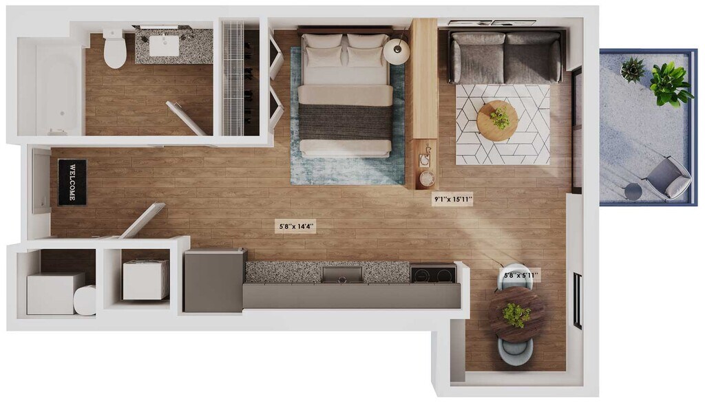 Modelo de apartamento: The LindberghLlame para PreciosEstudio, 1 Baño, 491 sq ftNo DisponibleThe Lindbergh - Plano 1 1 Dormitorio