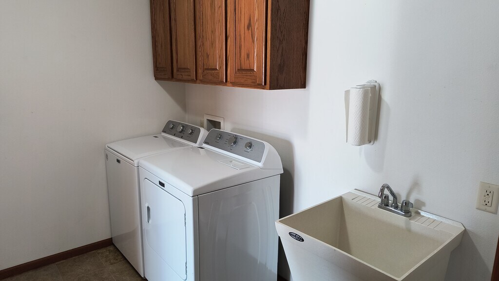 Single story slab-on-grade patio home, residential area, two stall garage, 3 bedroom, master bedroom with master bath and walk-in closet, large living room with new carpet, laundry set included. Cat friendly. Tenant pays for utilities.