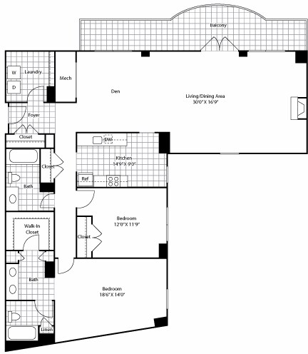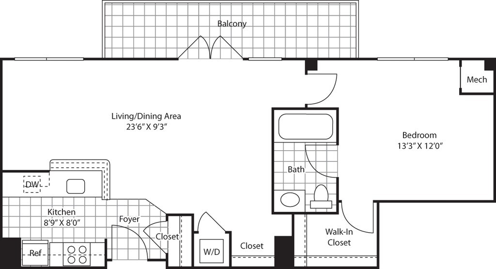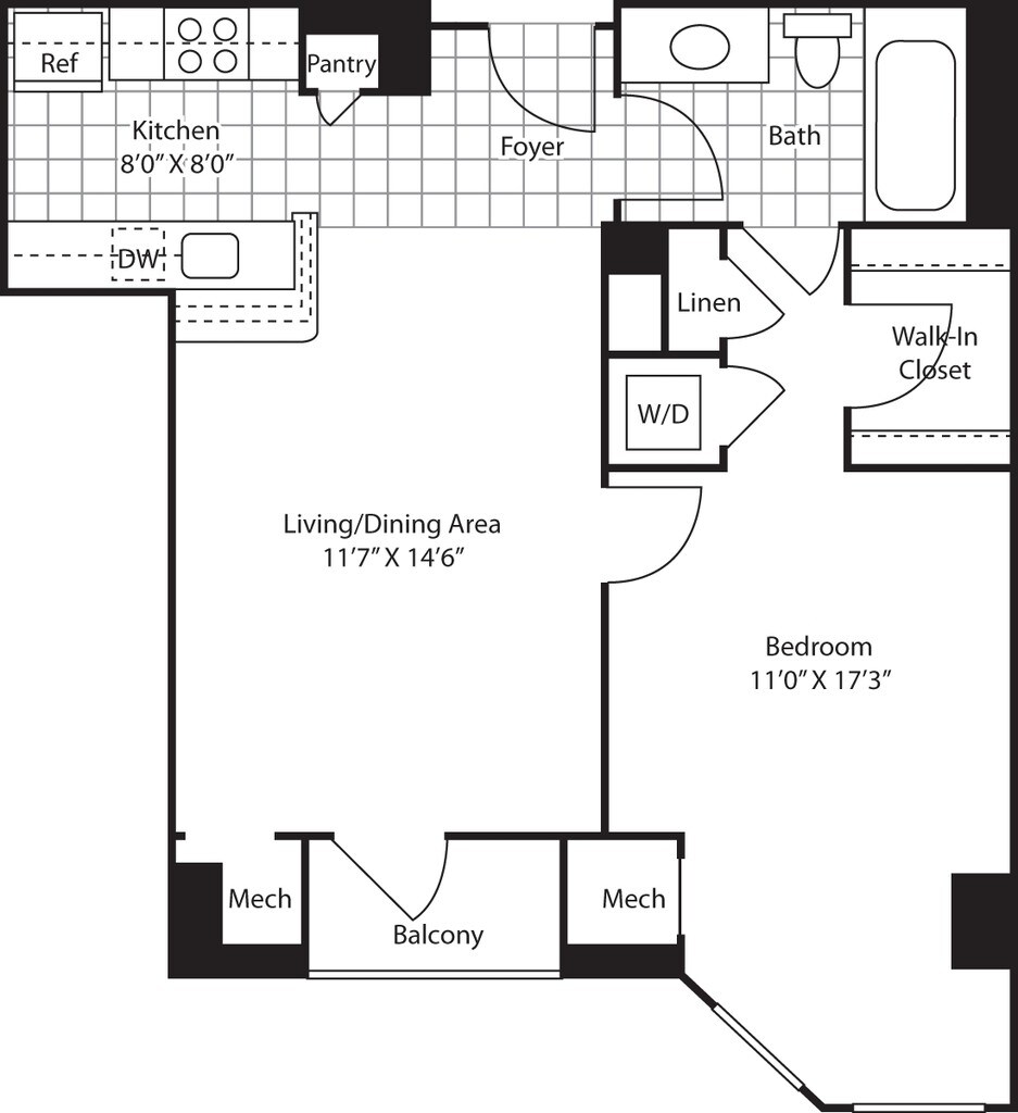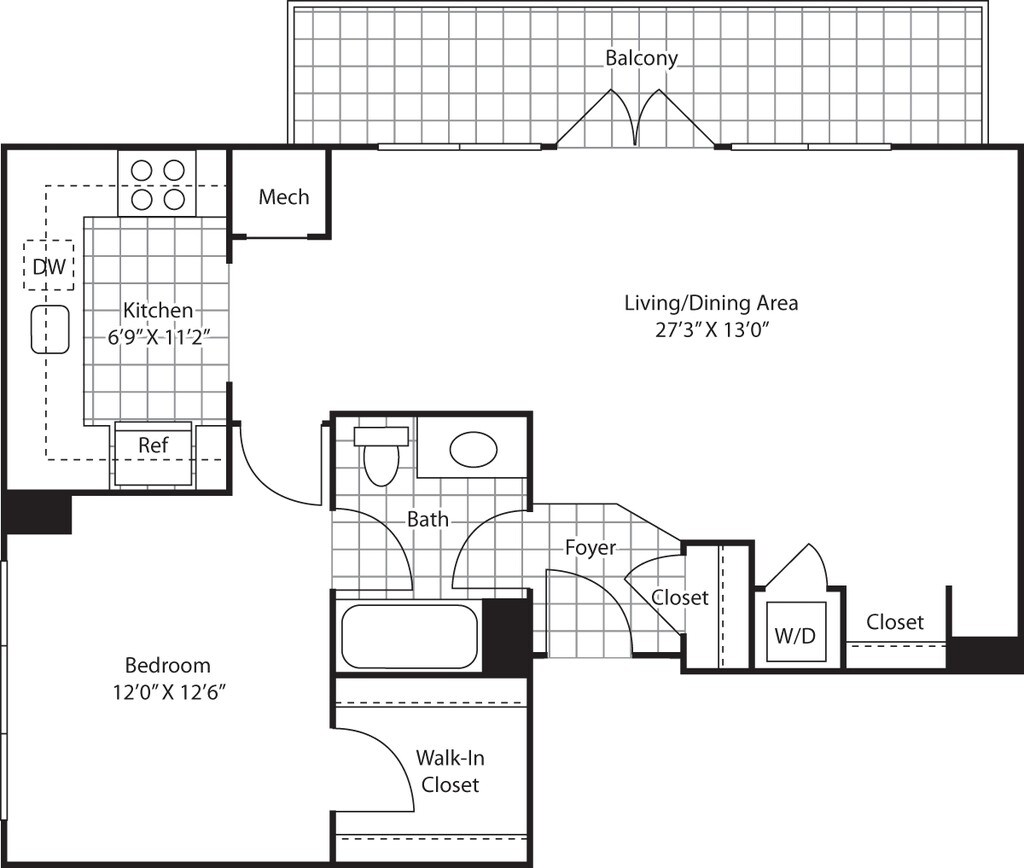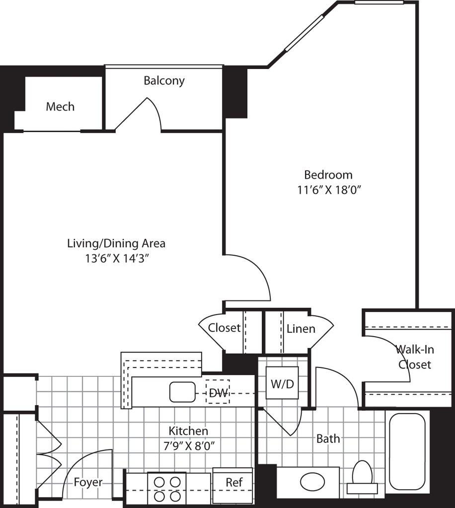Modelo de apartamento: ConcordLlame para Precios1 Dormitorio, 1 Baño, 713 sq ftNo Disponible![]()