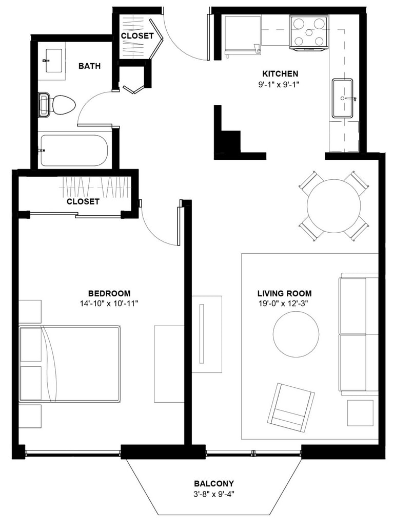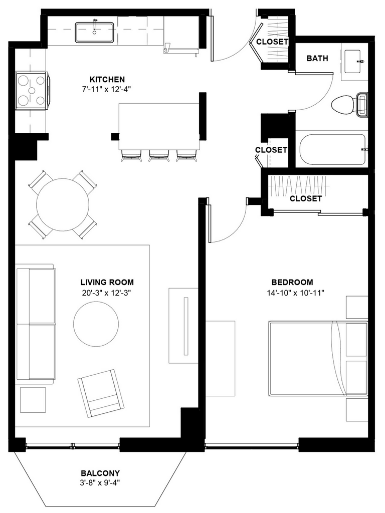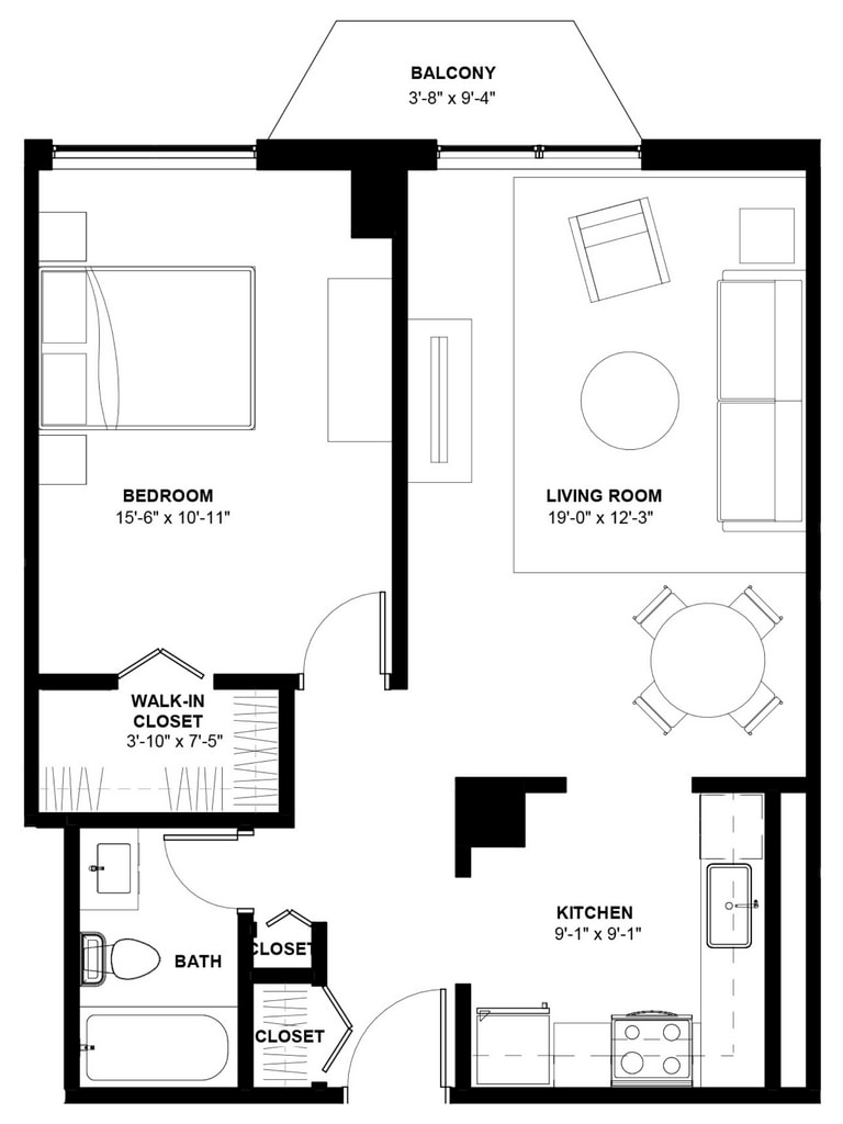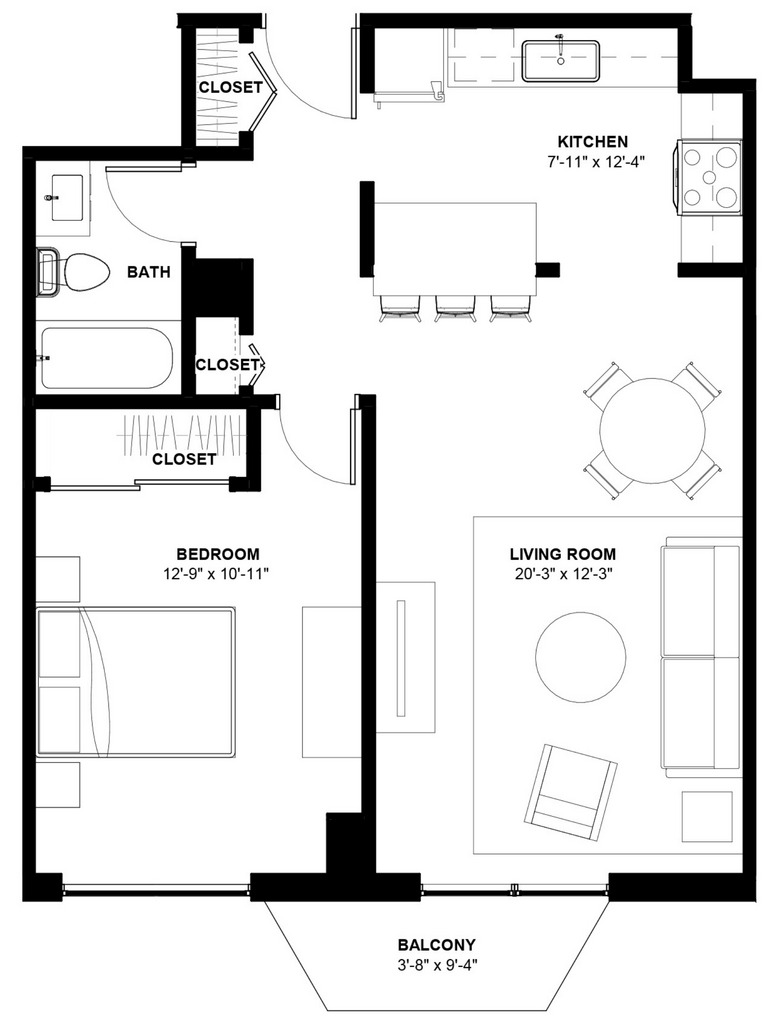 1 Dormitorio, 1 Baño, 630-733 pies²Galería del Modelo