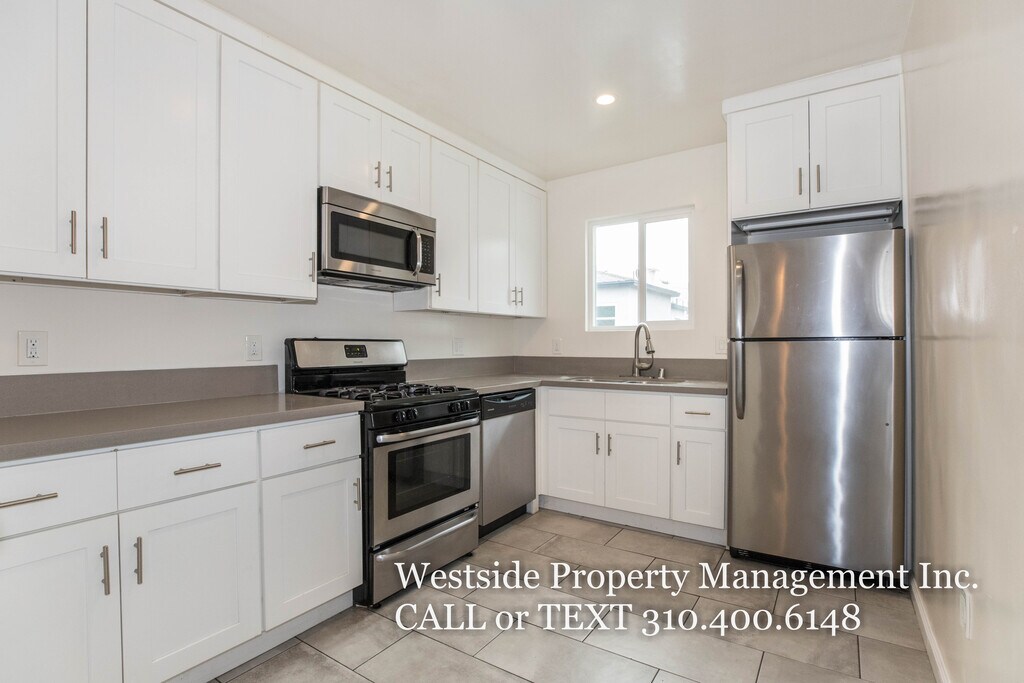 Remodeled building with modern design. High ceilings, beautiful plank laminate floor throughout and recessed lighting. Large living room flows right into the kitchen that is fully equipped with stainless steel appliances including, fridge, stove, microwave, dishwasher plus plenty of cabinet space and breakfast bar. Both bedrooms are spacious and bright with ample closet space. Hallway has one full bathroom with bathtub/shower combo, duals sinks. Property is beautifully landscaped and well maintained. 1 Tandem Parking Space (2 cars), Pets ok with additional pet rent, laundry on site, all utilities paid by tenant.