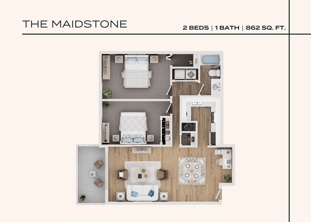 Modelo de apartamento: The MaidstoneDesde $1,1992 Dormitorios, 1 Baño, 862 sq ftDisponible Ahora![]()