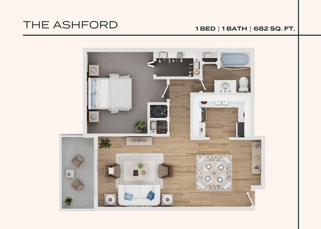 Modelo de apartamento: The AshfordLlame para Precios1 Dormitorio, 1 Baño, 682 sq ftNo Disponible![]()