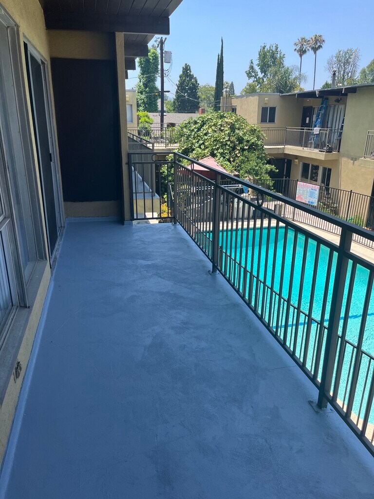 Great location in Sherman Oaks on Burbank Boulevard just West of Coldwater Canyon. This upper one bedroom one bathroom apartment has laminated wood floors, a refrigerator, a very large balcony. Laundry is in the building. The swimming pool is in the courtyard. Pet friendly. There is parking in the carport but will be remodeled for a couple months and rent will be reduced $100 for the time. Ample parking is available on street.