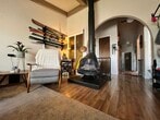 This retro-chic home blends vintage style with modern comfort; think exposed beam ceilings, a cool 1970s fireplace, and elegant arched entryways. Perfect for two, with room for a third, it features a deluxe king bed and a trundle that converts into another king. Step onto the spacious patio, where string lights twinkle overhead and a cozy swing invites you to unwind. Surrounded by trees, it's the perfect spot for sunset dinners and laid-back lounging. *Please note: service dogs only - HOA rule :( Cats are okay.