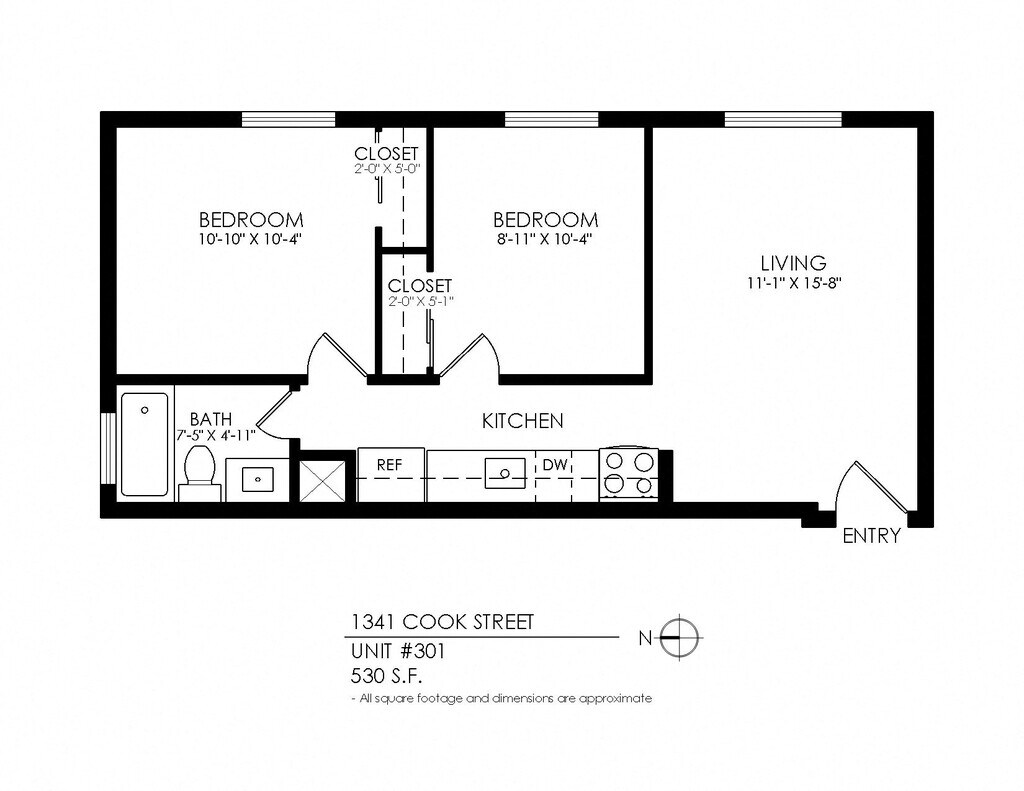 2 Bedroom - Plano 3 Unidad de apartamento: 105Modelo de apartamento: 2 Bedroom2 Dormitorios, 1 Baño, 510 sq ftDisponible Ahora![]()