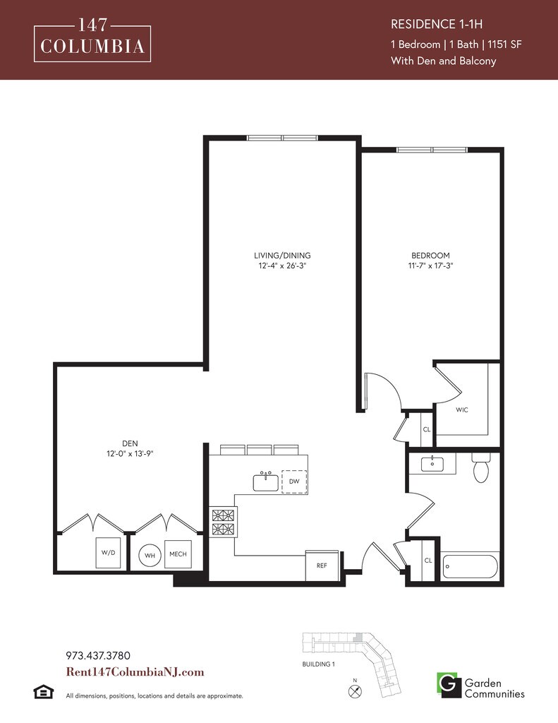 Modelo de apartamento: $2.95/sq.ft. - Residence 1-1HDesde $3,4001 Dormitorio, 1 Baño, 1151 sq ftNo Disponible![]()