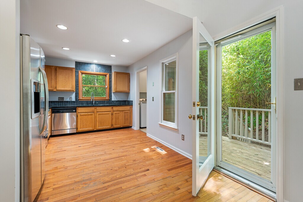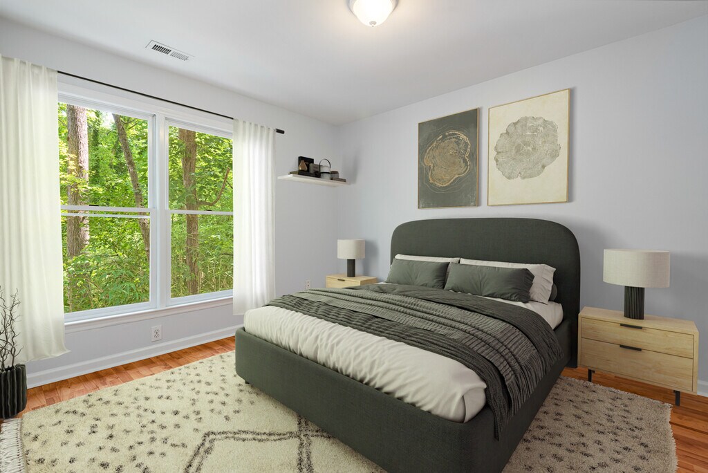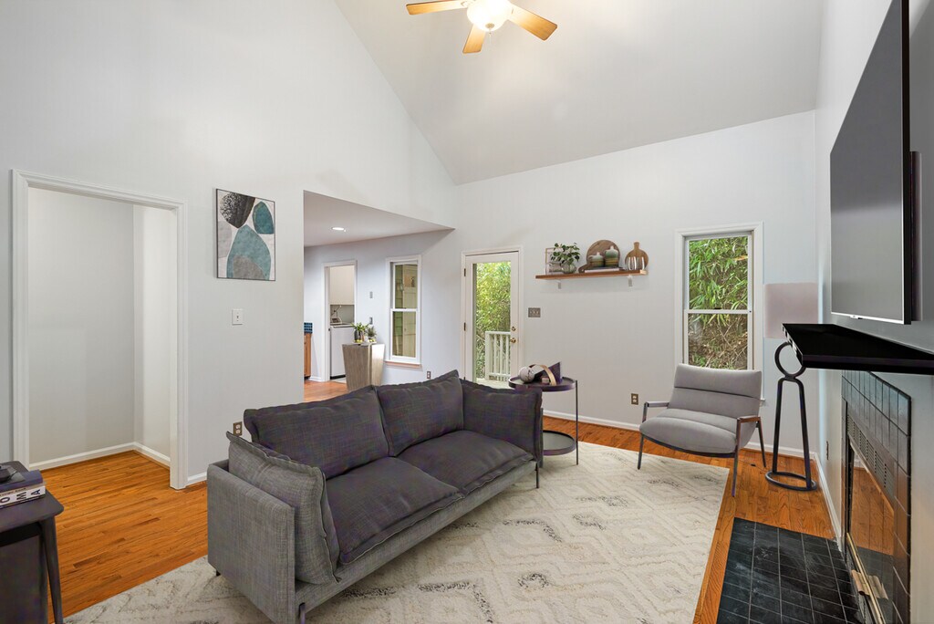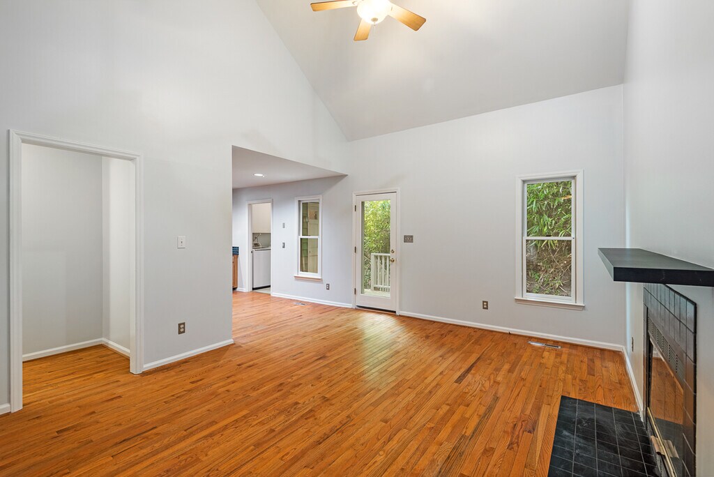 Attractive 3 beds/2 baths cedar siding house in a quiet cul-de-sac (Duke Park Neighborhood). Combined kitchen/living room with vaulted ceiling. Primary bedroom with en-suite bath located on the first floor. Two additional bedrooms upstairs with a shared bath. Ceiling fans in bedrooms and in the living room. Hardwood floors throughout. Interior recently repainted. Covered front porch. Fenced front yard with gate and fire pit. Small pets allowed. Driveway can accommodate 3 cars. Shed is available for tenant use. Washer/dryer provided. Bus Line #4 stop (Mangum St and Roxboro St) is a 5 minute walk away. ** This is a unfurnished house. Virtual staging is for virtualization purposes only. Could be partially furnished upon discussion. **