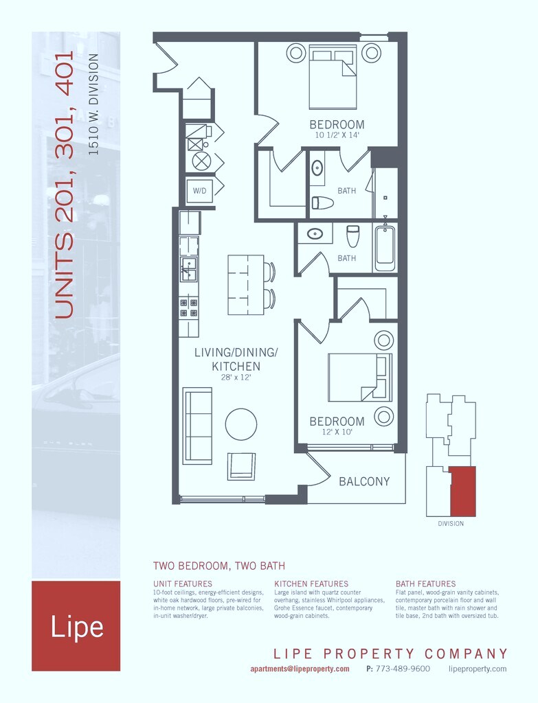 1510 W. Division es un edificio estilo boutique de reciente construcción de 12 apartamentos con un elevador en una excelente ubicación en Wicker Park, a unos pasos de distancia de la parada de la CTA Division Blue Line. El edificio cuenta con una entrada con acceso controlado, una fachada clásica de ladrillos rojos, amplias ventanas Pella, cocinas gourmet, acabados de diseñador, pisos de madera y espacios privados al aire libre. Estacionamiento de interior y al aire libre, así como también anclaje para bicicletas están disponibles en el edificio, ¡consulta!