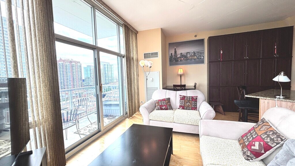 AVAILABLE NOW: Experience upscale city living in this fully furnished 1 bed, 2 bath private condominium with breathtaking views of Lake Michigan and the Chicago skyline. Simply bring your bags-this South Loop gem offers a spacious open floor plan with a private balcony, in-unit laundry, and a fully equipped kitchen featuring a coffee maker, toaster, cookware, and dinnerware. The generously sized bedroom includes bed linens, a walk-in closet, and a master bathroom, while the open dining area adds both comfort and functionality. The den can provide a study or gaming area. Large floor windows fill the home with natural light throughout the day, creating a bright and welcoming atmosphere. This full-amenity building includes a fitness center, rooftop deck, and secured garage parking. Rent includes water, gas, scavenger, internet access, exercise facilities, and one indoor parking space. Enjoy being just steps from the lakefront, Soldier Field, Grant Park, local restaurants, cafes, and more Call Stephen to schedule a tour today! Ref # 12 421700 Stephen John Suominen Broker Compass Listing Courtesy of Goodland Realty Inc