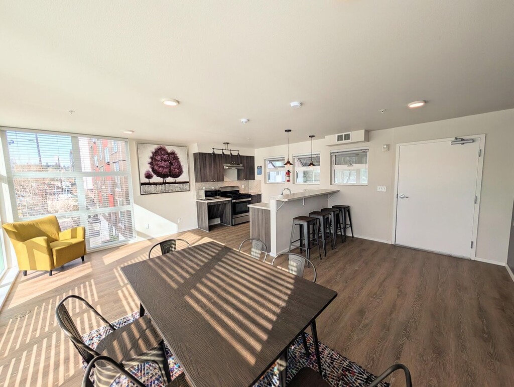 October 8, 2018I lived here for a summer. Good, semi-cheap studio apartments. I had to sign without visiting the place, and I was kind of disappointed when I got there. There are cons that the listing doesn't cover. Overall it was acceptable. They changed their short-term lease policy right before I signed, which wasn't great, unless they change it back it may not be the best for short-term. Pros: - Cheap-ish for the area. - New building. Everything is nice and clean, appliances all in great condition. - ...Walking distance from grocery stores, restaurants, parks. Right next to the transit center, lots of easily accessible bus routes. - Quiet (aside from the garage door). - Comes with great internet. - Furnishings: simple desk and chair, bed frame and mattress, microwave, mini fridge and freezer. Good laundry machines in the hallway. Cons - Floors are cement in the units and most common rooms. It's mostly smooth but has a lot of small bumps, never looks clean because of the spots and non-uniform color. Makes the rooms echo a lot. - No sink in the bathroom. There is only a tiny (maybe 9" by 12") sink in the kitchenette. - No AC. In the summer my room got up to the upper 80s, but I think there's only a few weeks out of the year that are bad. - Heating is through the floor, and takes 24 hours to reach the temperature you set. - Some rooms have twin sized beds. You have to ask. - No closet or dresser. Some wall-mounted shelves are provided. - There are common kitchens, but the fridges are each entirely taken up by 4 tenants who put large plastic boxes full of their food in them, so you generally have to carry all your stuff up from your room. You can't leave dishes or cooking utensils there unless you are OK with anyone in the building using them (according to the property manager). I just bought a hot plate to use in my room.Leer MásReseña de Apartments.com