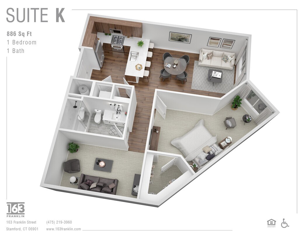 Suite L - Plano 1 Unidad de apartamento: 409Modelo de apartamento: Suite L$2,9001 Dormitorio, 1 Baño, 888 sq ftDisponible December 6, 2025Suite G