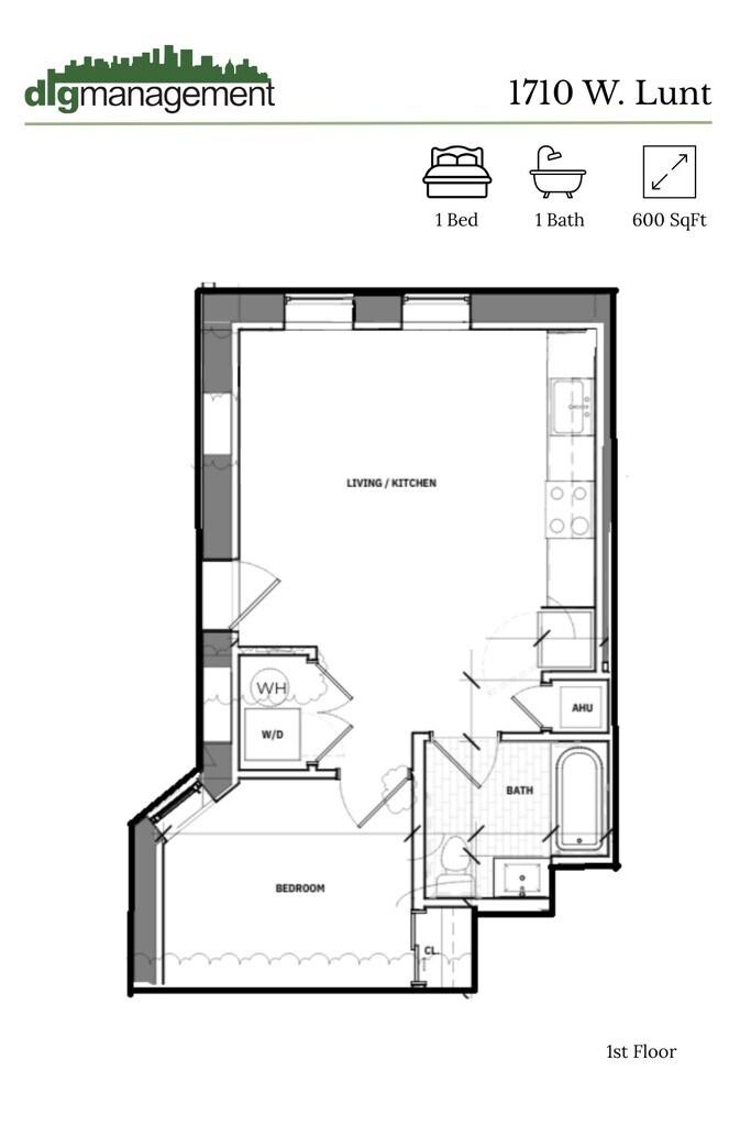 Unidad de apartamento: 101Modelo de apartamento: 1 Bed, 1 bath$2,0001 Dormitorio, 1 Baño, 600 sq ftDisponible November 1, 2025$1,900