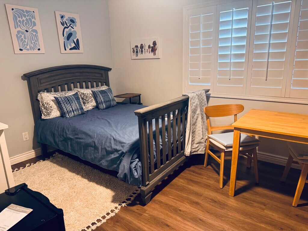 Large room for rent. 1 BR with mini fridge, dining table, desk, dresser, TV with Netflix, walk in Closet. Shutters and Black out curtains on windows. The Bathroom will primarily be yours however, it is the main house bathroom. Tub/shower will be exclusively yours. Will be shared with guests occasionally. Full size bed with comfortable mattress and bedding. Shared spaced: Backyard space has a huge yard with a pool, propane fire pit, gazebo. Kitchen with separate coffee bar and regular bar and 2 living room's. We are a quiet couple with grown children and grandchildren. Our family is always welcome so must love family and dogs.