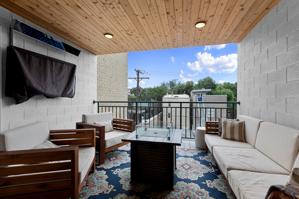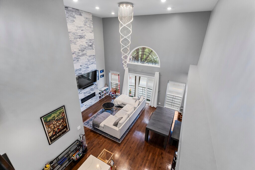This furnished second-floor duplex-up has 20-foot ceilings, 2200 square feet, and sits right in the middle of Division, surrounded by restaurants and the energy of the Wicker Park neighborhood. With 3 bedrooms and 2 bathrooms, the large open floor plan lives more like a single family home in the city. All bedrooms comfortably fit king-sized beds, and the enormous primary suite includes a custom walk-in closet, a spacious bathroom with double vanity, separate rain shower, soaking tub, and heated towel rack, along with a large den / play area directly off the suite. The second bedroom includes a built-in Murphy bed and office space. The family room has a newly redone custom fireplace, chandelier, and custom lighting was added throughout with 36 fixtures. The kitchen is outfitted with quartz countertops, stainless steel appliances, and a chalkboard wall. All closets have been redone and customized for maximum efficiency and organization. Two large private decks are equipped with custom lighting, heating, and outdoor TV. Additional features include in-unit laundry, 2,200 square feet of living space, and a bright south-facing layout. Located in a prime Wicker Park spot right on Division with Milwaukee just around the corner. Target and Solidcore are one block away, and Jewel Osco and the Division Blue Line stop are just two blocks away. Property Management firm requires mandatory Resident Benefits Package for an additional $40.00 per month; includes renters insurance, positive credit reporting for on-time rental payments, identity fraud protection and more.