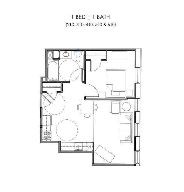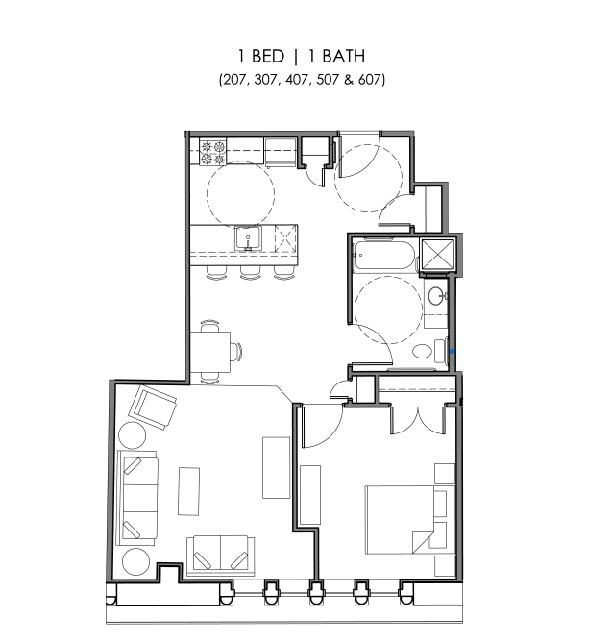 1 Dormitorio, 1 Baño, 607-618 pies²Precio Mensual TotalDisponible Dec 5Galería del Modelo