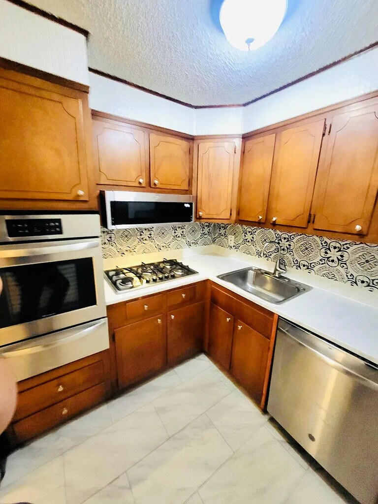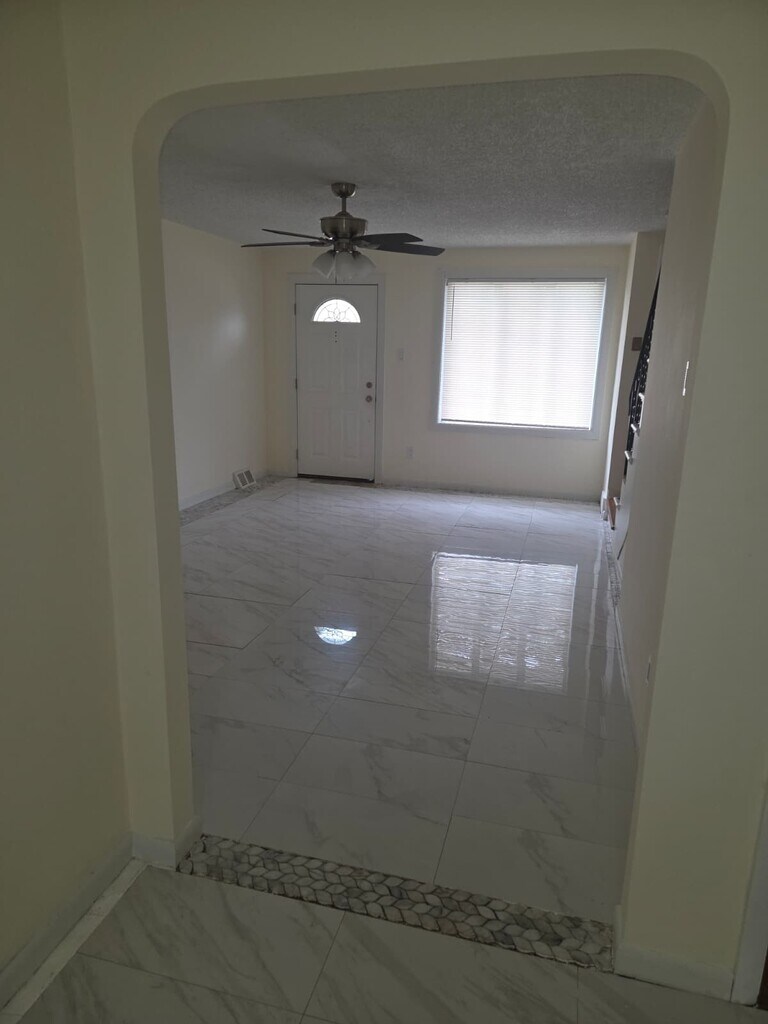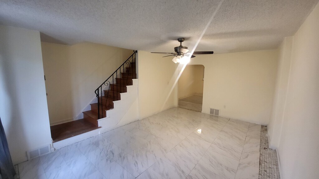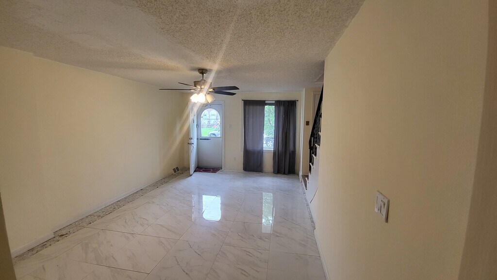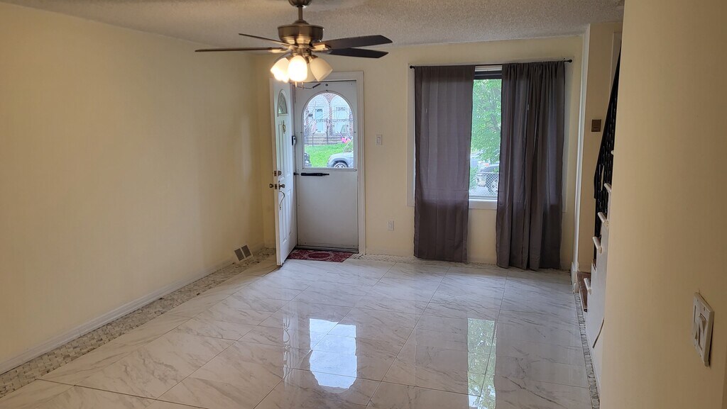 Welcome to 1896 Carter rd, updated historic row-home, situated in Delmare Village neighborhood. easy access to the shopping, dining, septa and more. The 1st floor features an open layout with a combined living and dining area. The modern kitchen has stainless steel appliances, including a gas stove, refrigerator, microwave, and dishwasher. The 2nd floor features three bedrooms, each with ceiling fans and ample natural light. The bathrooms on this level include a tub and shower, with clean white tile throughout. Additional highlights include a cozy finished basement and a charming front porch.