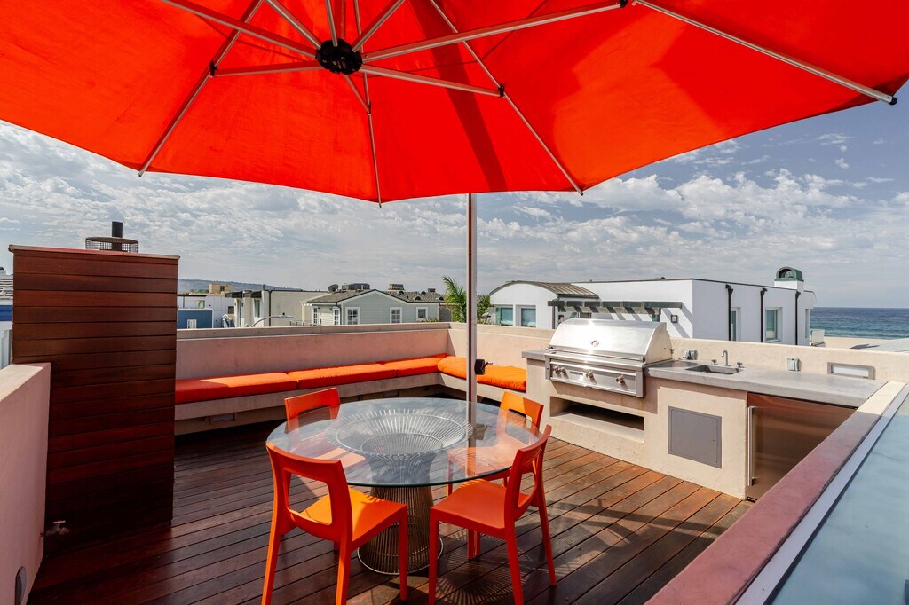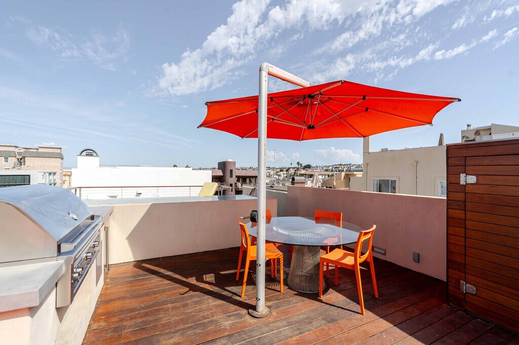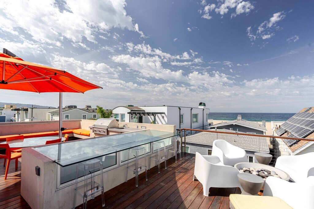 Furnished Rentals (1-11+ Month Terms) Located on a Hermosa Beach corner lot! Contemporary 2-Bed (2-Queens + 1-Queen Size Sofa Bed) 2-Bath 1,015 Sq. Ft. home with air conditioning! Beautiful hardwood floors throughout, limestone countertops, & vaulted ceilings with tons of natural lighting makes for a very inviting living area! Modern kitchen with a Sub-Zero refrigerator with dual freezer drawers & a Miele stovetop! The huge rooftop deck boasts a large tabletop that doubles as a skylight below! Perfect for entertaining, equipped with a refrigerator, sink, BBQ, custom-designed cushions, oversized umbrella, & a chaise lounge. Comes with a 2-car garage + 1-parking permit & the garage has polished pebble flooring. There's an outdoor shower + side yard with gated beach access this home perfectly combines luxury & comfort making it an ideal beachside retreat! Prices go up during the Summer months. Sorry no pets!