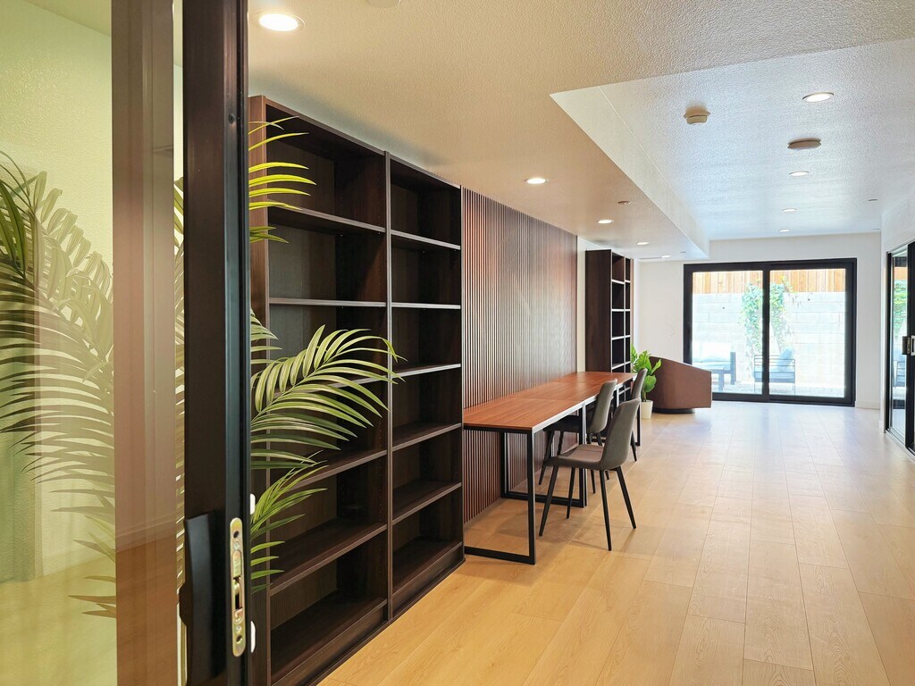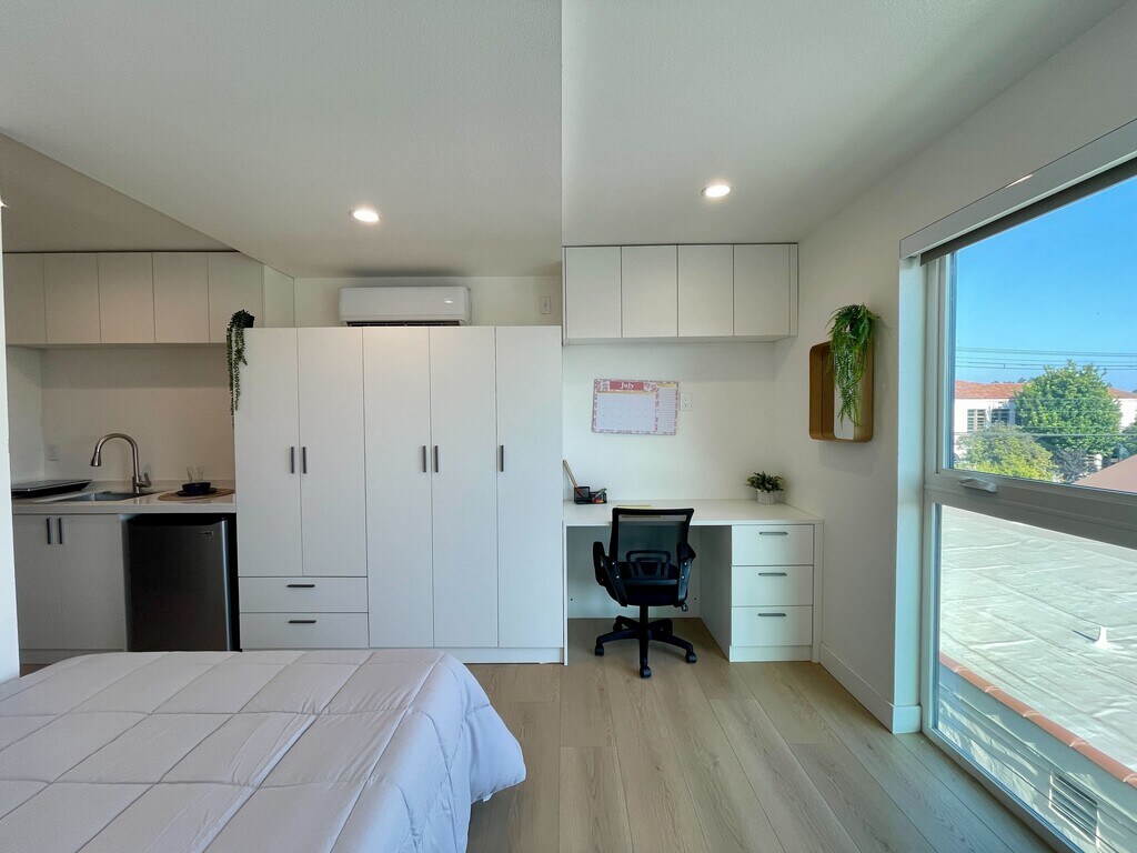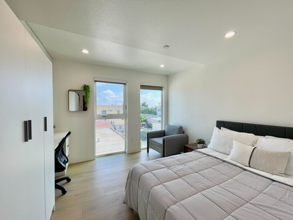 Welcome to Nexus on Commonwealth — your private 330 sf suite in the heart of Los Feliz, LA’s vibrant gem. Enjoy modern comfort in a lively, walkable neighborhood. Short-term leases (6-9 months) available at a different rate. Step into a fresh space with sleek, high-quality laminate flooring. The cozy full bed has a nightstand; a closet keeps things tidy. A sofa chair, desk, and mini AC unit add function and comfort. The kitchenette offers a sink, mini-fridge, and electric burner. Two communal kitchens downstairs suit bigger meals. The private bathroom has a walk-in shower and vanity with mirror. Relax in the backyard with lounge chairs and a table. Practical amenities like onsite laundry center, street parking, an on-site gym, a business center, and a social lounge enhance your living experience. Located in a quiet neighborhood with easy access to trendy eateries, stores, and Griffith Park, this private suite is not just a living space but a lifestyle upgrade. Embrace the ease of new construction and thoughtful amenities in your Los Angeles sanctuary. Book now!