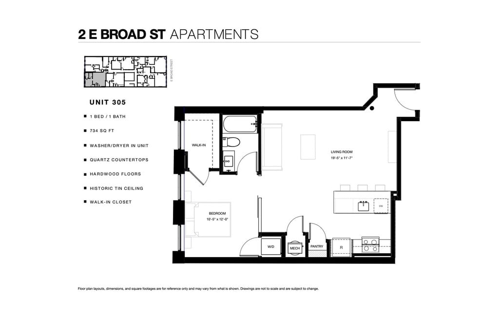 2 E Broad St ofrece apartamentos de 1 a 2 Dormitorios desde $1,195 con 564–1,160 pies cuadrados. Aquí está el precio actual y la disponibilidad: