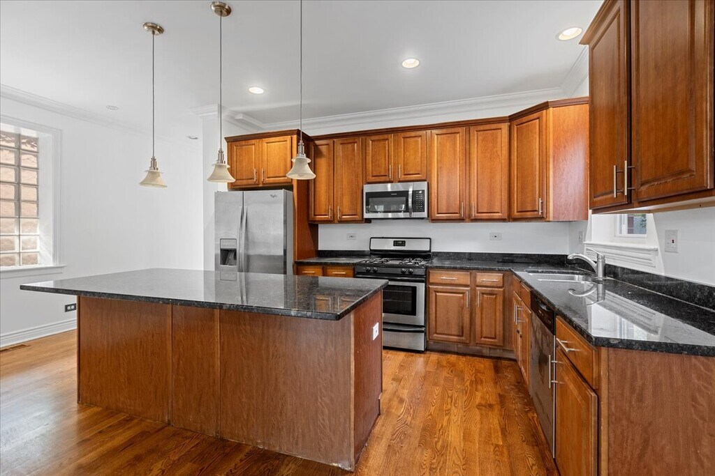 Spacious and updated 3 bed/2.5 bath duplex down with over 2,000 sq ft in convenient Rogers Park location! This home offers two large living areas, a private balcony, open-concept kitchen with 42" cabinets and abundant storage, and a primary suite with jacuzzi tub and double vanity. Enjoy the comfort of side-by-side laundry in your own laundry room with utility sink, a cozy gas fireplace, and spacious bedrooms throughout. One garage parking space included! Easy access to mulitple grocery stores, parks, the lake, and Rogers Park Metra, Howard Red Line, and multiple bus routes.