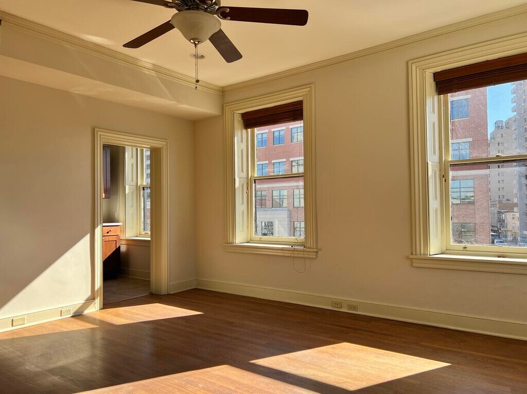 New renovation! This large, third floor, one bedroom apartment is incredibly bright. The large windows offer a river view. Brand new kitchen includes dishwasher, garbage disposal and built in microwave. Quartz counters. Apartment offers gorgeous wood floors, tall ceilings and window treatments, including original wood shutters. Lots of historic character. Brand new furnace with central air. Free laundry on site. Easy walk to everything downtown, including Capitol complex, Riverfront Park and next door to Cork & Fork. Lease term is one year. Tenant pays electric and flat $35/mo for water. Trash included in rent. Pets permitted.