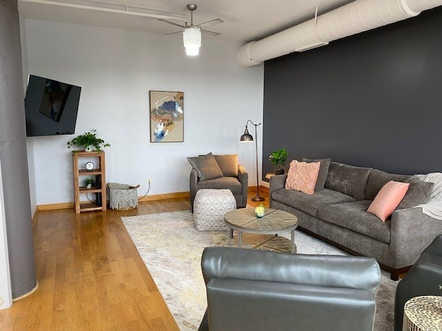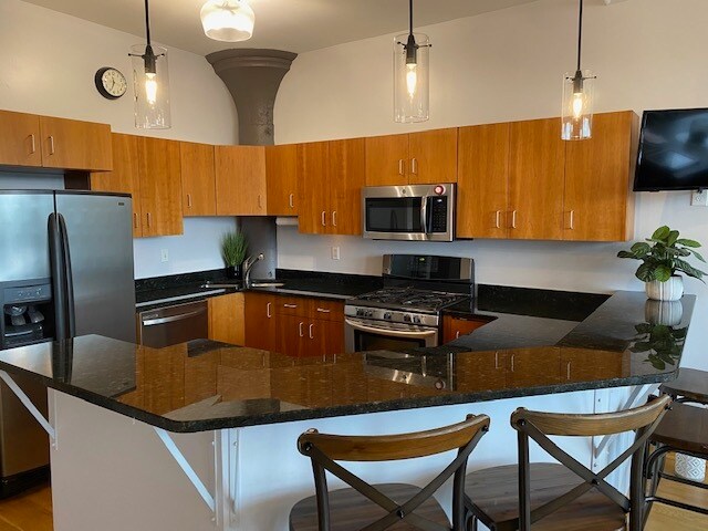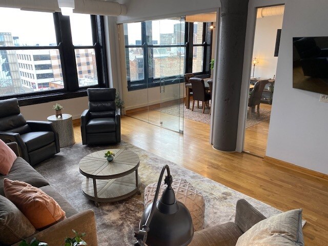 Amazing Location!! Unique downtown opportunity located in the heart of the East 4th entertainment district. This well-appointed unit is the ideal combination of original industrial elements and modern sophistication. The sleek contemporary kitchen offers granite counters and large wrap around breakfast bar that is open to the entire living space making it ideal for entertaining guests. Expansive windows allow for stunning city views. Hardwood floors throughout the unit. The large primary bedroom offers an en-suite bath with double granite vanity and spacious walk-in closet providing ample storage. There is an additional bedroom and full bath also with granite counters. Large utility / laundry room with utility sink completes the unit. East 4th offers world-class dining and entertainment in the middle of Downtown Cleveland. You can enjoy a game with hundreds of other fans supporting The Land. Taste some of the best craft brews and drinks the city has to offer. Get your game on with bowling and arcade games. 4th street is designed for pedestrian traffic and home to many restaurants, bars, and clubs. Close to everything! Furnished or unfurnished.