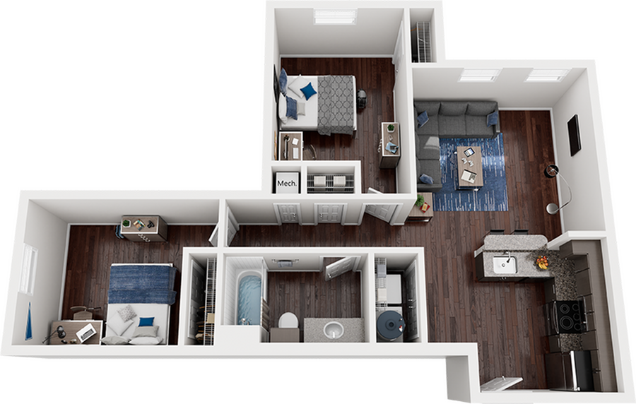 Modelo de apartamento: 1 Bed x 1 Bath Loft1 Dormitorio, 2 Baños, 745 sq ftDisponible August 17, 2026![]()