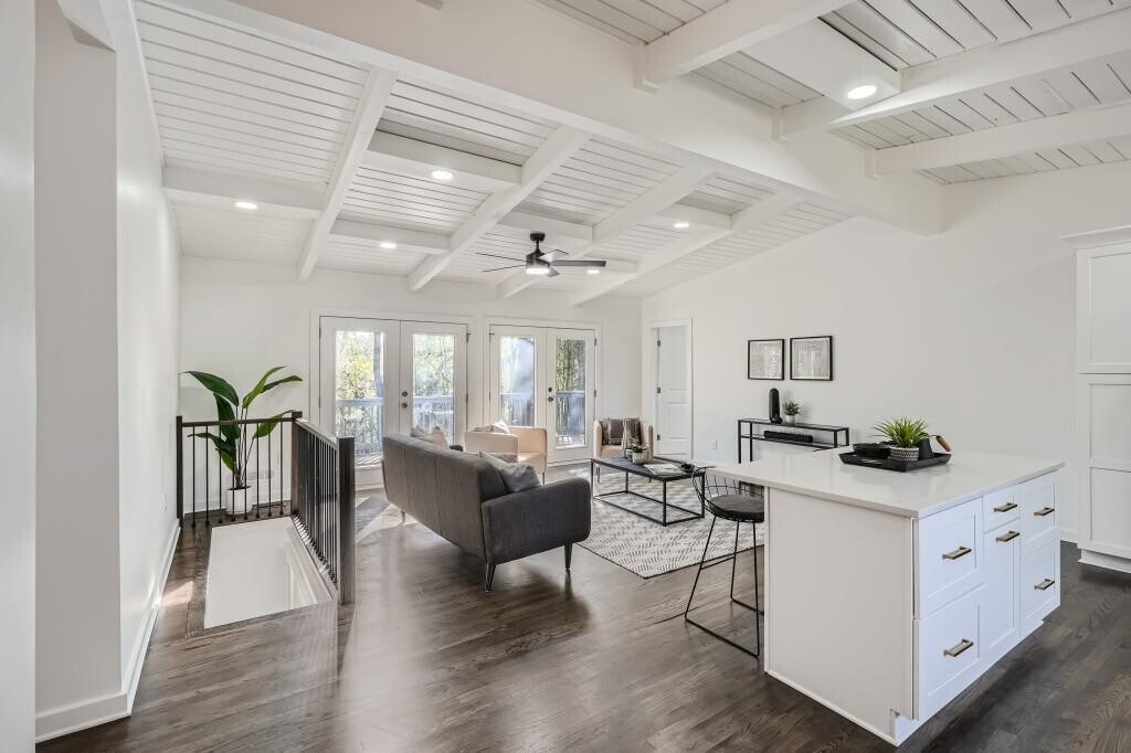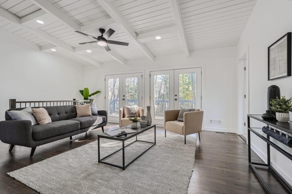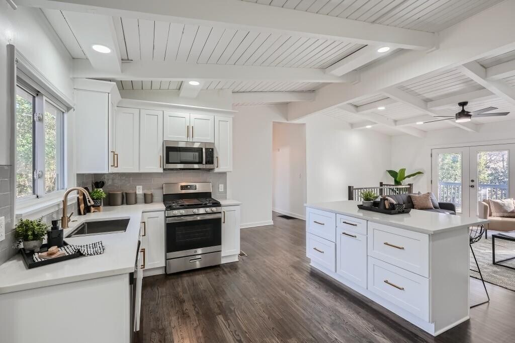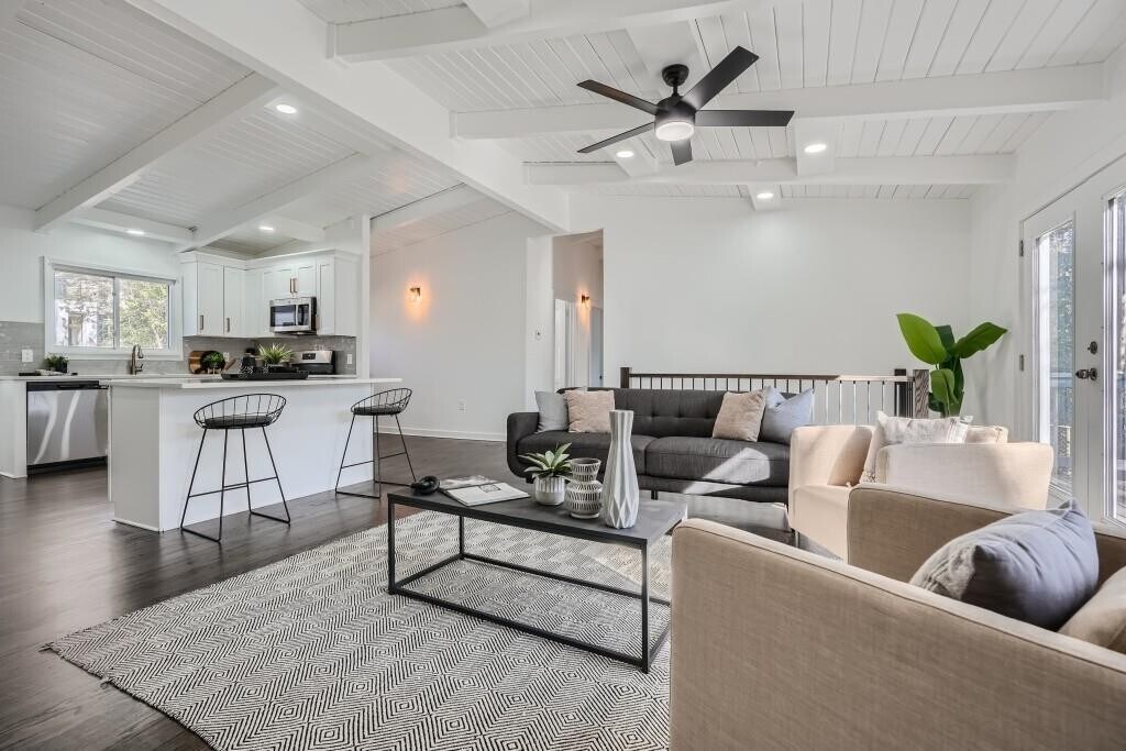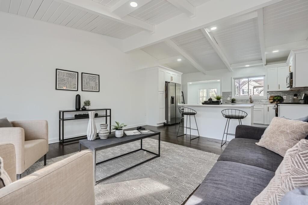 Discover this fully renovated mid-century gem with a bright and open living space featuring soaring vaulted ceilings. The kitchen features stainless steel appliances, quartz countertops, and shaker cabinets. The primary suite includes a double vanity, shower and soaking tub. Three additional bedrooms share a well appointed full-bathroom on the other side of the home. The open living room opens seamlessly into a grand back deck, perfect for entertaining. Minutes from a multitude of shopping and restaurants, incredible authentic international cuisine. Available immediately