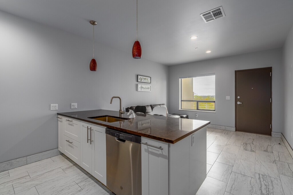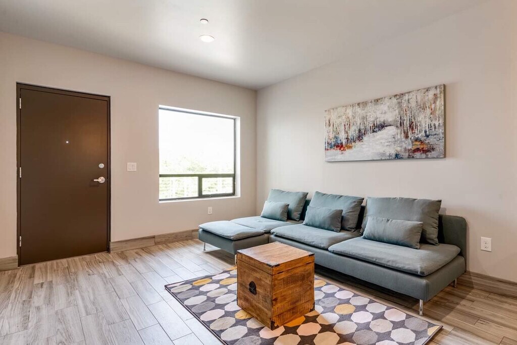 Apartment for Rent! Partially Furnished, 1 bed 1 bath apartment that is ready to be moved into. Modern kitchen and living room. Appliances and full size Washer/Dryer Combo provided. Located on the 3rd floor, above Heaven's Bistro Bakery; elevator access available. It is a 5-10 minutes drive to an ACC campus and 15 minutes drive from the Domain. The rent includes utilities - water and gas. Great Corporate unit.