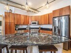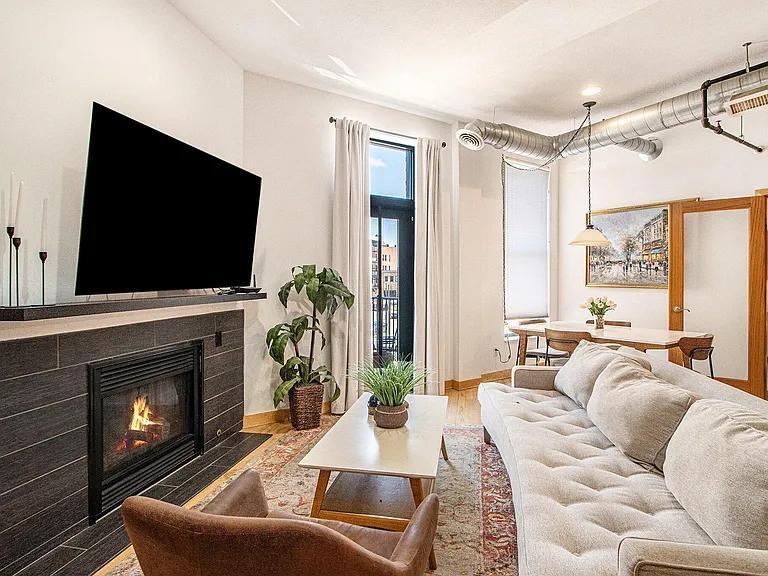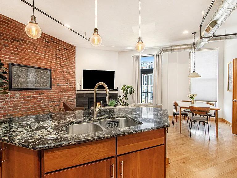 Don't miss this rare opportunity to enjoy vibrant downtown condo living with unbeatable access to shops, restaurants, bars, businesses, and the upcoming Kalamazoo Event Center and Arena. This stylish unit offers a bright, open floor plan with tall ceilings, exposed brick, hardwood floors, and abundant natural light throughout. The kitchen is designed for both function and flair, featuring granite countertops, a large center island, stainless-steel appliances, and a gas range. Unwind in the cozy living area with a gas fireplace, or step out onto your private balcony overlooking the Arcadia Creek Festival site — perfect for taking in city views and downtown energy. A washer and dryer are included in-unit, and there's a generous 6x9 basement storage area for your overflow items. Bonus: While this is a one-bedroom unit, a Murphy bed cleverly tucked into the front foyer allows for a private guest space when needed offering flexibility without sacrificing style.