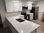 Updated with gourmet eat in kitchen, with stainless steel appliances, quartz countertops, white shaker cabinets. open floor plan, white shaker vanity with marble top, W/D hookups, utility room, carport.