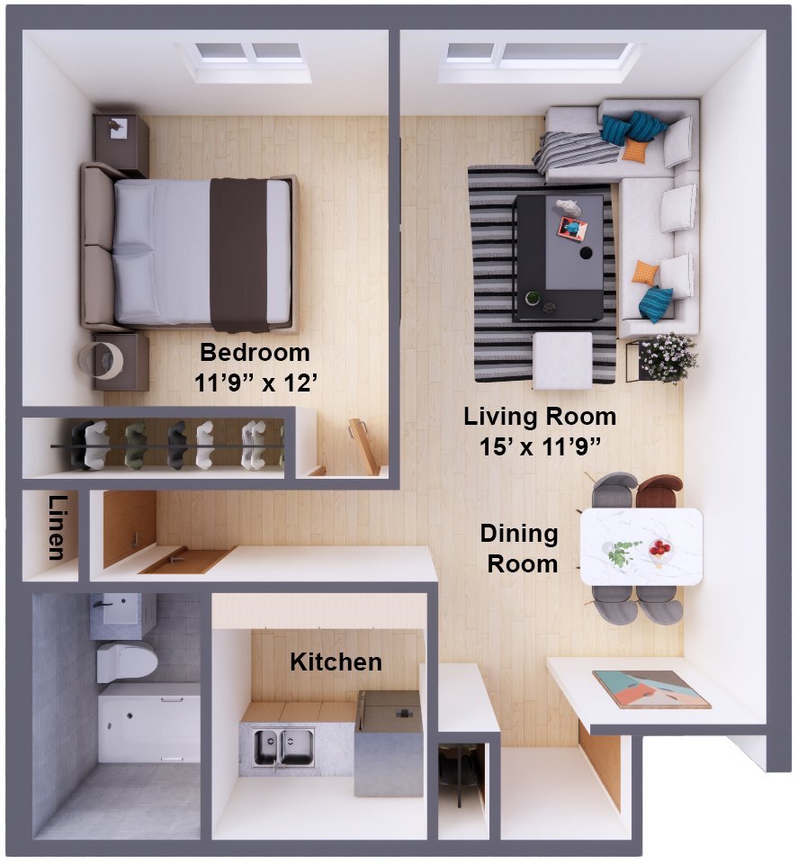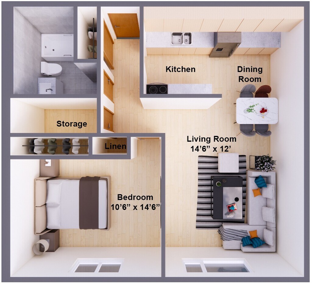 2 Dormitorios, 1 Baño, 750 pies²Disponible AhoraGalería del Modelo