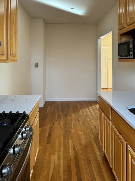 Located at 24-15 27th St, Astoria, NY 11102. It is a two-bedroom unit featuring a spacious entryway, beautiful hardwood floors throughout, and a large living room with an east-facing window and a generously sized closet. The kitchen offers plenty of space for a dining table. The building is conveniently located near the Astoria Blvd N/W train and is within walking distance to Astoria Park.
