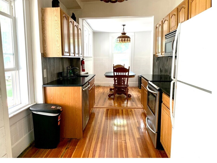 Big beautiful home, with 5 bedrooms and 3.5 bathrooms , all recently renovated. All stainless steel appliances; refrigerator, dishwasher, stove, microwave. Washer & dryer Hardwood floors throughout. 1 bedroom with 1/2 bath on ground level, 3 bedrooms and full bath on 2nd floor and a cozy family room with kitchen and full bathroom on top floor. Basement also has legal full bathroom and kitchenette, perfect for additional entertainment. Private parking in backyard for up to 4 vehicles and also a 24'x24' 2 car garage can be made available. Close to all shops, movie theater, Albany Med and law schools, this is a perfect home. Owner pays for water & sewage and garbage disposal. Deposit and 1st month due upon signing lease. This is a no smoking property.