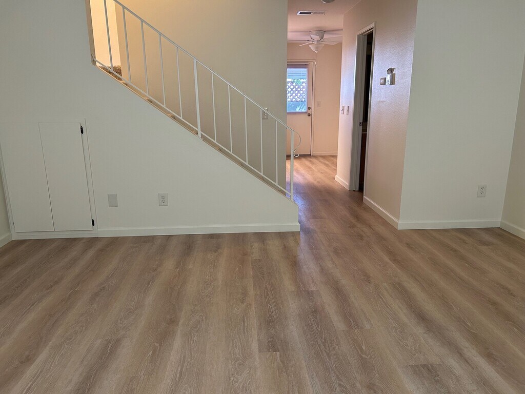 Large 2bdrm, 2&1/2 bath, 2-level Townhouse (no one above or below you). Beautiful kitchen with appliances, gas stove & dishwasher, and all new cupboards and ledges. Vinyl Wood Plank living area flooring, and plush carpet in bedrooms. Central AC/heat plus ceiling fans in dining area and bedrooms. Community Amenities: Quiet central garden courtyard entry to all units. Shady grassy area with barbequeing, eating tables and relaxation adirondack chairs. Small community (17 units) of friendly long-term neighbors. Gated off-street parking. On-site laundry. Close to Wells Park with new sports courts and green grass playing fields.
