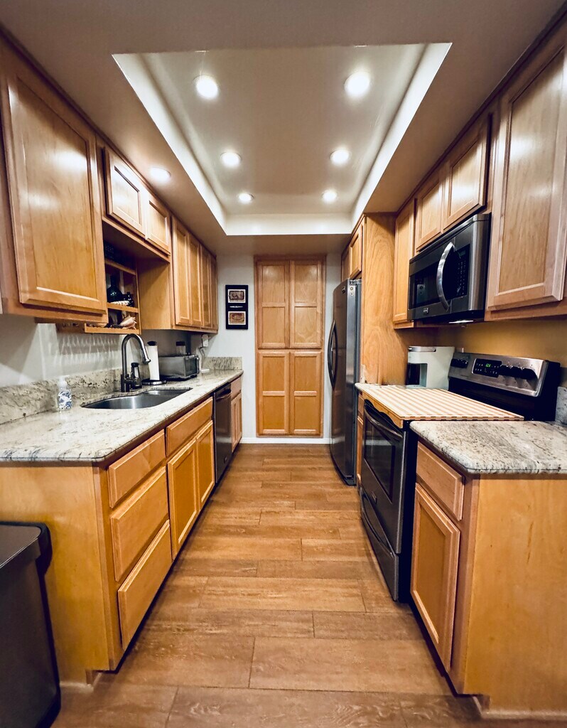 Every day feels like a beach day! Beautifully upgraded 1-bedroom, 1-bath ground-level condo in the gated Spinnaker Run community of Dana Point. Enjoy private trail access to Doheny State Beach, Dana Point Harbor, and River Street Marketplace. Features include: granite kitchen with stainless steel appliances, spacious bedroom with barn doors and walk-in closet, upgraded bathroom, wood-style tile flooring, in-unit laundry with washer/dryer, private patio with pool view, and brand-new dual-pane window/sliding door. Rare bonus: A/C in both living room and bedroom and ceiling fans. Community amenities: pool, spa, sauna, one assigned parking, and pet-friendly (with $50 pet rent). Water and trash included. Close to parks, trails, dining, and entertainment, this lifestyle property won't last!