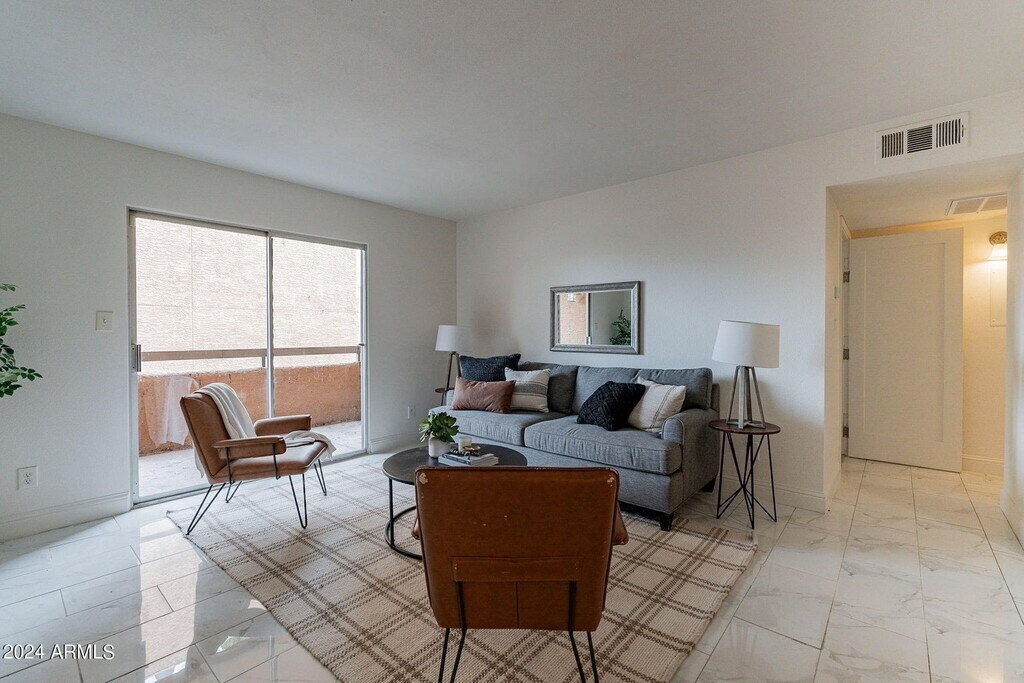 Resort-style living in gated community near the Biltmore, minutes from the 51 freeway, and world-class shopping and restaurants. Close to downtown, Arcadia, and Paradise Valley. This 1 bedroom 1 bath unit is updated with white tile, cabinets and counters, and has new A/C, refrigerator, washer/dryer and carpet. This quiet unit is near the back of the complex and has a private, shaded balcony, and a covered parking spot.