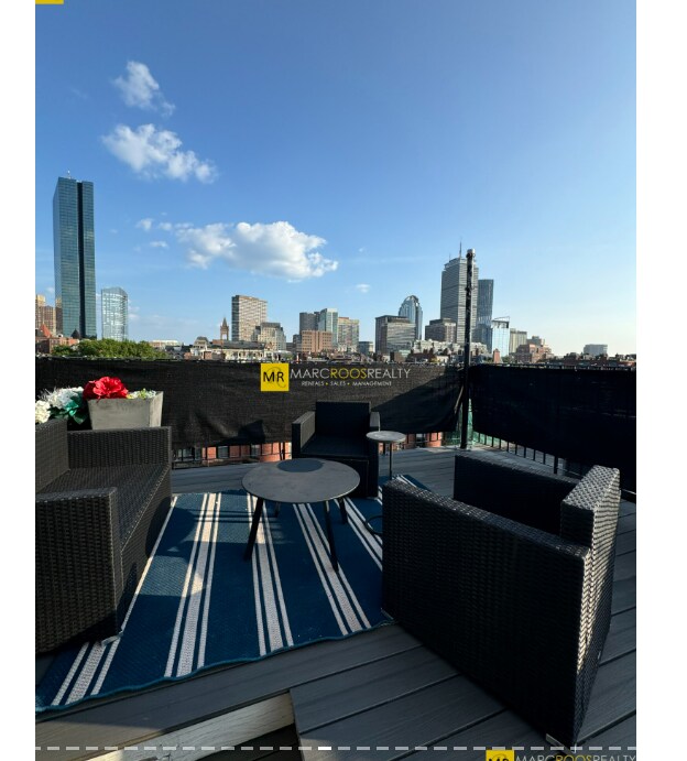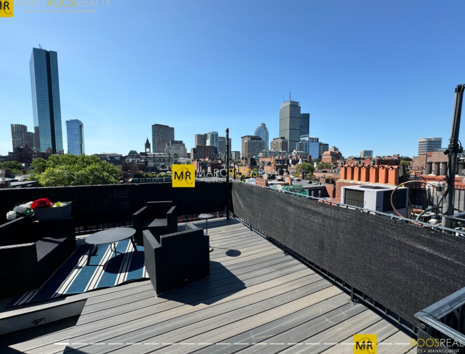 Front Facing! Totally Renovated 2BD floor-through Penthouse w/ 300 sqft private roof deck featuring sweeping City & Charles River views. Steps from Copley square and the Esplanade, this sophisticated 2020 renovation combines original Back Bay character including Carrara marble and exposed brick with modern luxury and elegance. All new kitchen, bathroom, recessed and chandelier lighting, central air, built-in closets & restored flooring.Wonderful open layout can accommodate spacious living + dining and features a Marble wood-burning fireplace, oversized windows,10 ft ceilings and soaring skylights. The large kitchen features quartz counter, backsplash & breakfast bar, custom cabinets, abundant storage & Bosch appliances. The chic bathroom w/marble accents compliments the entire design. Two bright bedrooms feature built-in closets and charming views.In-unit spiral stairs provide access to the private roof deck and cherished outdoor space. 4th Floor Walk Up.
