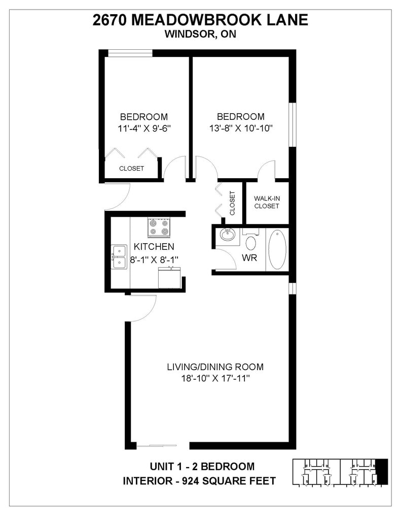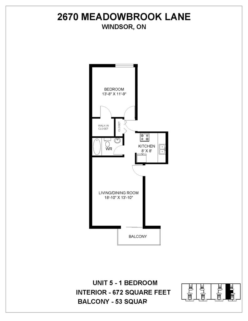 These Meadowbrook apartment rentals offer 9 buildings to choose from that are 3 storey walk ups which are located at 2670 to 2676 Meadowbrook Lane, 2680 to 2686 Meadowbrook Lane, 2690 to 2696 Meadowbrook Lane, 2701 to 2707 Meadowbrook Lane, 2711 to 2719 Meadowbrook Lane, 2723 to 2729 Meadowbrook Lane.When you live at the Meadowbrook apartment rentals you are surrounded by green space with a balcony, or a ground floor unit with a patio. In these buildings we offer studio, 1 bedroom and 2 bedroom rental apartments. These units have vinyl planking in the living room, hall, bedrooms and kitchen with tile in the bathroom. Each unit has a storage locker on the main floor of the building, as well as convenient laundry facilities on the main floor in every one of our minutes from the E.C. Row Expressway which will bring you to the quaint town of Amherstburg, full of history, restaurants and shopping or if you go in the other direction you have the Belle River which has a lovely beach and park which was recently expanded and improved. You are also walking distance to grocery shopping and dining options on Lauzon Parkway and Tecumseh Road East.Rental ProcessWe are open for business and have refined our online rental process. View our 360-degree virtual tours, which give a general sense of unit layouts and finishes. We also encourage you to schedule a personal showing with our leasing specialist who would be happy to safely tour you through amenities and available suites.Online Payments and CommunicationsProperty Vista resident portal is available to ensure the ease of rental payments, maintenance requests, and communication with property management – all accessible online from your personal device.*Pricing, availability, and incentives are subject to change. Conditions apply. Suite features may vary. Images and virtual tours may not reflect actual suite finishes. E. & O.E.** Sterling Karamar Property Management is committed to providing an exceptional leasing experience. We do not request a fee to book a tour or a deposit to reserve a suite.
