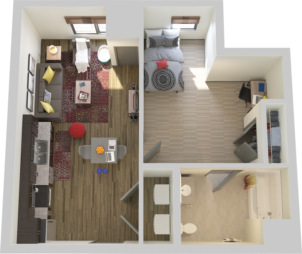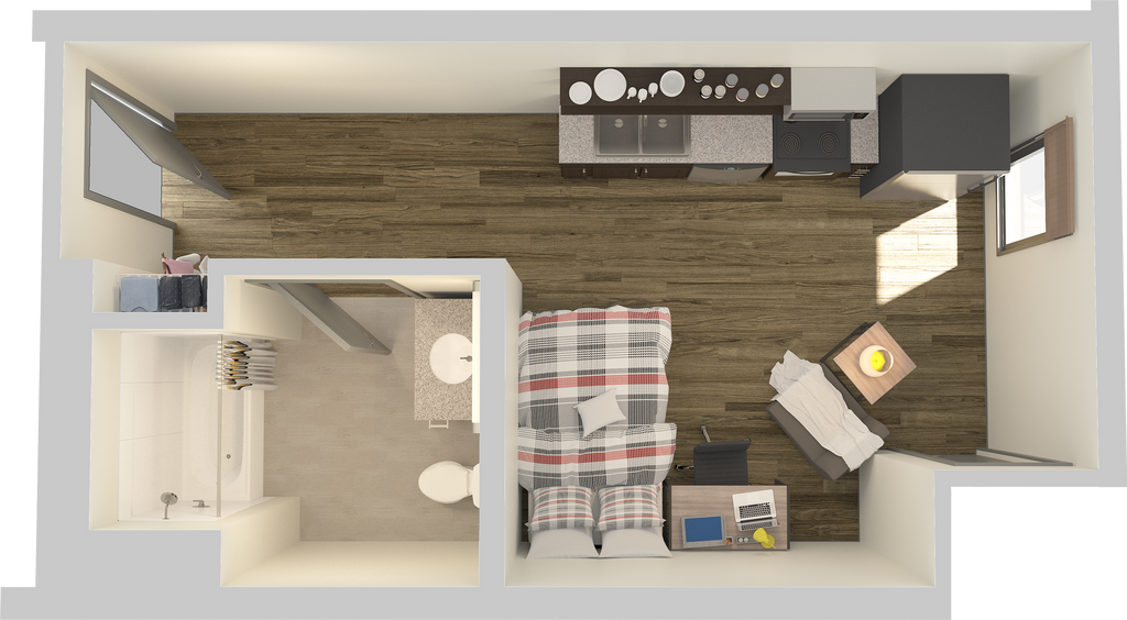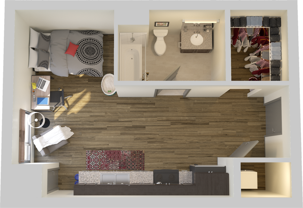 STUDIO - Suite - Plano 1 Unidad de apartamento: PrivateModelo de apartamento: STUDIO - Suite$1,500Estudio, 1 Baño, 416 sq ftDisponible August 14, 20261 Dormitorio