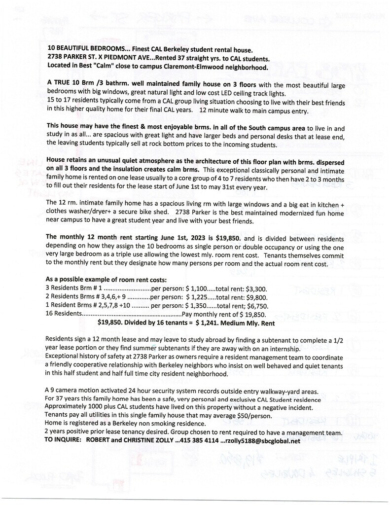 2738 PARKER STREET X PIEDMONT AVE. ES ...Un verdadero estilo de casa de 10 habitaciones en tres pisos. Este tranquilo hogar de la familia es muy tranquilo, íntimo y puedes tener los mejores y más grandes de la diversión de todas las habitaciones de Southside CAL viviendas para estudiantes. 3.200 pies. Cuadrados. Casa unifamiliar con un fuerte seguridad en cuenta la historia para CAL Berkeley los estudiantes como de los propietarios elegir de alquiler con un contrato de arrendamiento a un grupo tiene familiaridad con los demás y no en alquiler salas individuales como estudiante amigos y contactos como resultado una casa más armonioso como esta todavía es una Berkeley 1/2 estudiantes y 1/2 ciudadano de trabajo vecindario. Esta hermosa sala en 12 casa de tres pisos cuenta con una amplia área de ingreso sala de estar y un muy cerca también gran cocina con 3 refrigerador, un lavaplatos, y una comida más nuevos gabinetes de gran tamaño, lavadora y secadora de ropa. Debe ser que esta casa conserva tu tranquilo, íntimo y tranquilo ambiente como la arquitectura y planos de planta con alfombrado de senderos peatonales y distribuir las habitaciones en los tres pisos con un baño completo en cada piso permite que la familia privacidad de esta casa de ser lo más importante. El apartamento cuenta con una cámara de 9 sensor de movimiento que los registros del sistema de cámaras de 24 horas, todos los días y se ha convertido en un mejor seguridad especialmente durante estos últimos muy desafiante años cuando muchas de las ciudades han experimentado una gran variedad de problemas. Esta casa cuenta con gran más segura sin trágica historia de actividades de 37 años...gracias a nuestro sistema de administración, maravilloso inquilinos inteligentes y la buena fortuna. El 10 habitaciones son amplios, con techos altos, ventanas altas y mucho luz natural. Además de las luces de planta no son necesarias como la casa tiene un cargo bajo riel de luz LED en cada sistema de techo, lo que permite a los estudiantes tienen la opción de estudiar en la cama o en tus escritorios que están en cada una de las grandes habitaciones. Cada salir de estudiante en contrato de arrendamiento final siempre parece a vender tus muebles principal de una cama, silla y escritorio de la recepción de los nuevos inquilinos a precios muy rock parte inferior...la tradición parece haber hecho para que nunca en...y los altos techos habitaciones son realmente hermoso y divertido para estudiar o de descanso en. El grupo de la casa asigna tus miembros la habitación real de alquiler y decide qué habitaciones son personas que viajan solas o dobles de acuerdo con tus amistades y gentes de que tu presupuesto total combinado el alquiler mensual que para este año será $19.850. Para 16 a los residentes. A solo para determinar un cargo promedio por persona...$19.850 dividirse en 16 residentes es igual a...$ 1.241. Por persona, pero porque las personas de elegir entre diferentes tamaños, pero todas las encantadoras habitaciones y el número de habitantes que hay conocer los precios específicos donde personas que viajan solas cargo de aprox. $1.350. Camas dobles cargo de aprox. $1.225. Y de una ocupación triple en la habitación más grande cuesta aproximadamente. $1.100. Por persona. Por lo tanto,...16 personas en conjunto, el promedio de cada uno de aproximadamente $1.241/mes por 2738 Parker, que sigue siendo uno de los mejor conservados absolutamente homes para estudiantes en el lado sur de la ciudad de Berkeley...muy cerca del campus, pero en un tranquilo vecindario respetado.