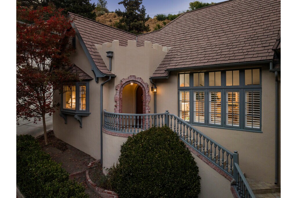 Stunning Beachwood Canyon Storybook English home. Offering 2,612 square feet of refined living space, this property includes a 3-bedroom, 2.5-bathroom main home and a thoughtfully designed newer construction ADU above the garage. Complete with a kitchenette, full bath, and custom Murphy bed, the ADU serves as an ideal space for guests, a home office, or a private getaway. Step inside the main house to discover exquisite hardwood floors, period details, and stunning stained-glass accents. The sunken living room, crowned with 11-foot ceilings, is centered around a charming fireplace, while the adjacent formal dining room opens through French doors to a spectacular outdoor space designed for entertaining. The chef's kitchen is a true entertainer's delight, featuring a Viking 6-burner range with griddle, Viking refrigerator, Calcutta marble countertops, and a lovely breakfast nook perfect for slow mornings and lively conversations. Downstairs, two flexible spaces offer endless possibilities: a gym or playroom and a separate den/office with its own custom Murphy bed. Outside, an inviting private sanctuary awaits complete with an outdoor fireplace, a 36" Coyote grill at the drink station, and a whimsical treehouse that adds a touch of magic to the lush backyard. Set in a prime Beachwood Canyon location, this home provides the perfect balance of tranquility and accessibility, just moments from scenic hiking trails, Beachwood Cafe, and Beachwood Market. Additional conveniences include covered parking with a 220V outlet for EV charging, a second driveway space, and ample guest parking behind the home on the street-to-street lot. Available unfurnished, with the ADU included. Pet-friendly because every home should welcome a woof and a meow!