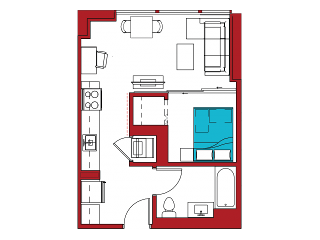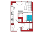 Studio - Plano 1 Los planos de la planta son una interpretación artística. Todas las dimensiones son aproximadas. Los tamaños o el detalle del producto real y sus especificaciones pueden variar. No todas las características están disponibles en todos los hogares para rentar. Los precios y la disponibilidad están sujetos a cambios. El alquiler que se muestra es mensual. Se pueden aplicar ciertos cargos, por ejemplo, entrega de paquetes, recolección de basura, agua, servicios, etc. Depositos varian. Consulta a un representante para conocer detalles.